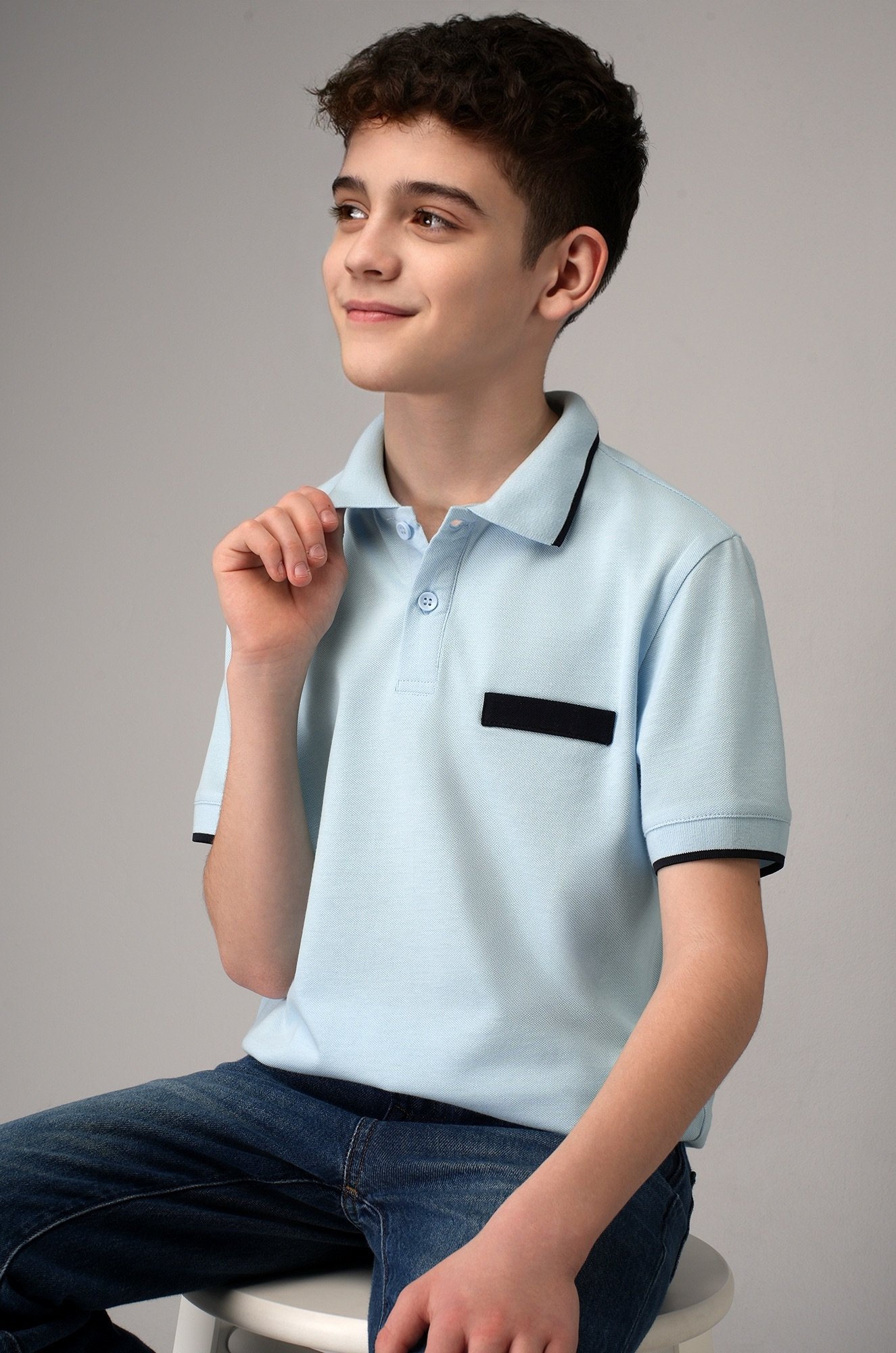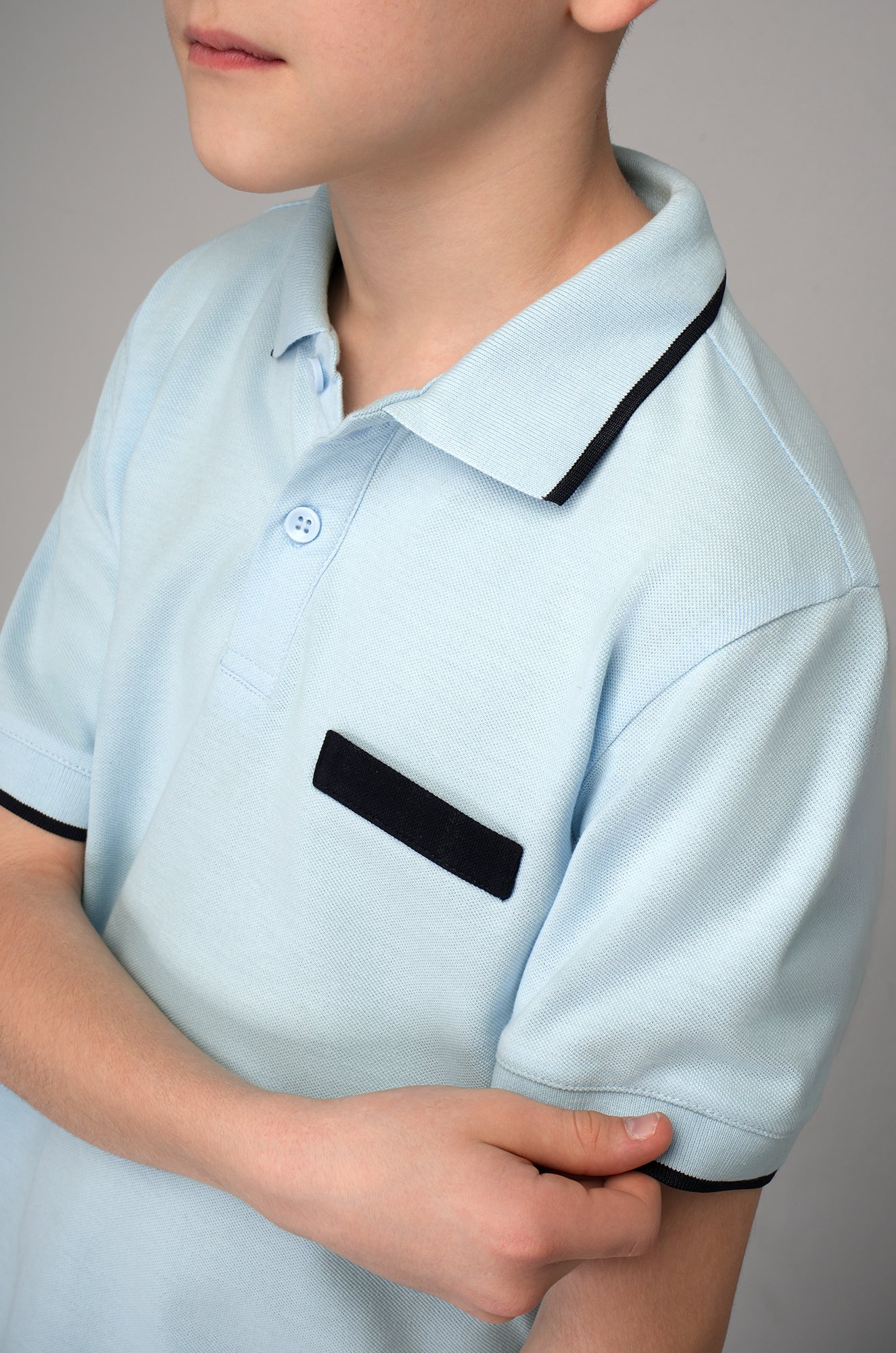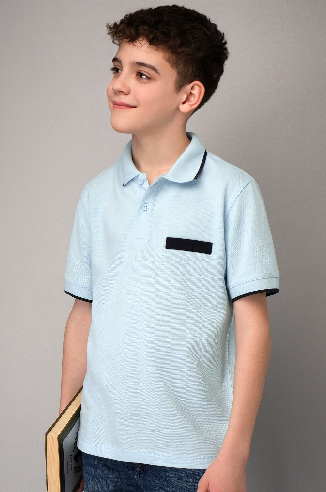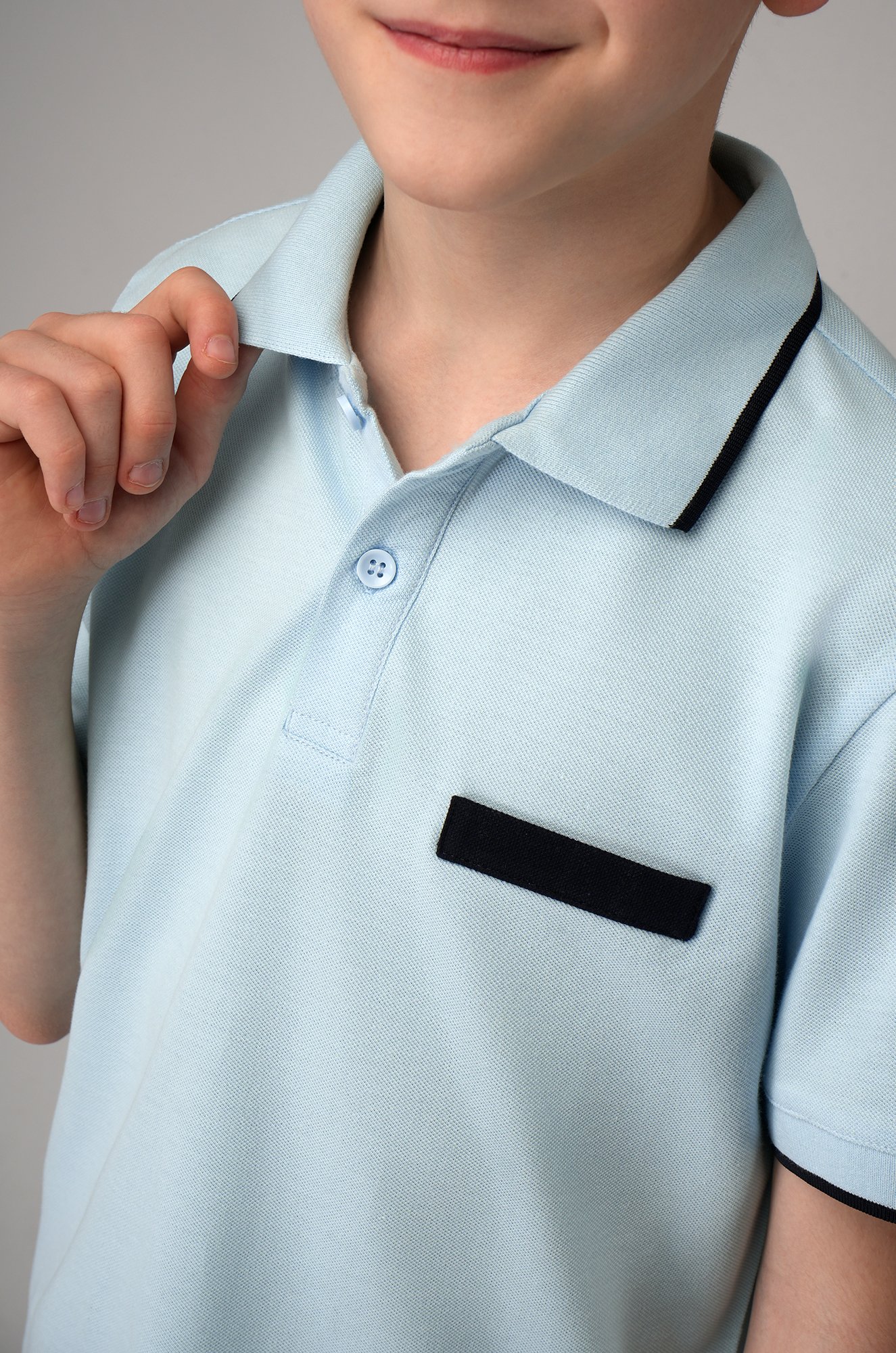 Голубая футболка-поло для мальчика – это беспроигрышный вариант для школы и прогулок. Лаконичный дизайн с контрастными вставками на воротнике и рукавах добавляет стильности, а карман-обманка делает образ выразительным.