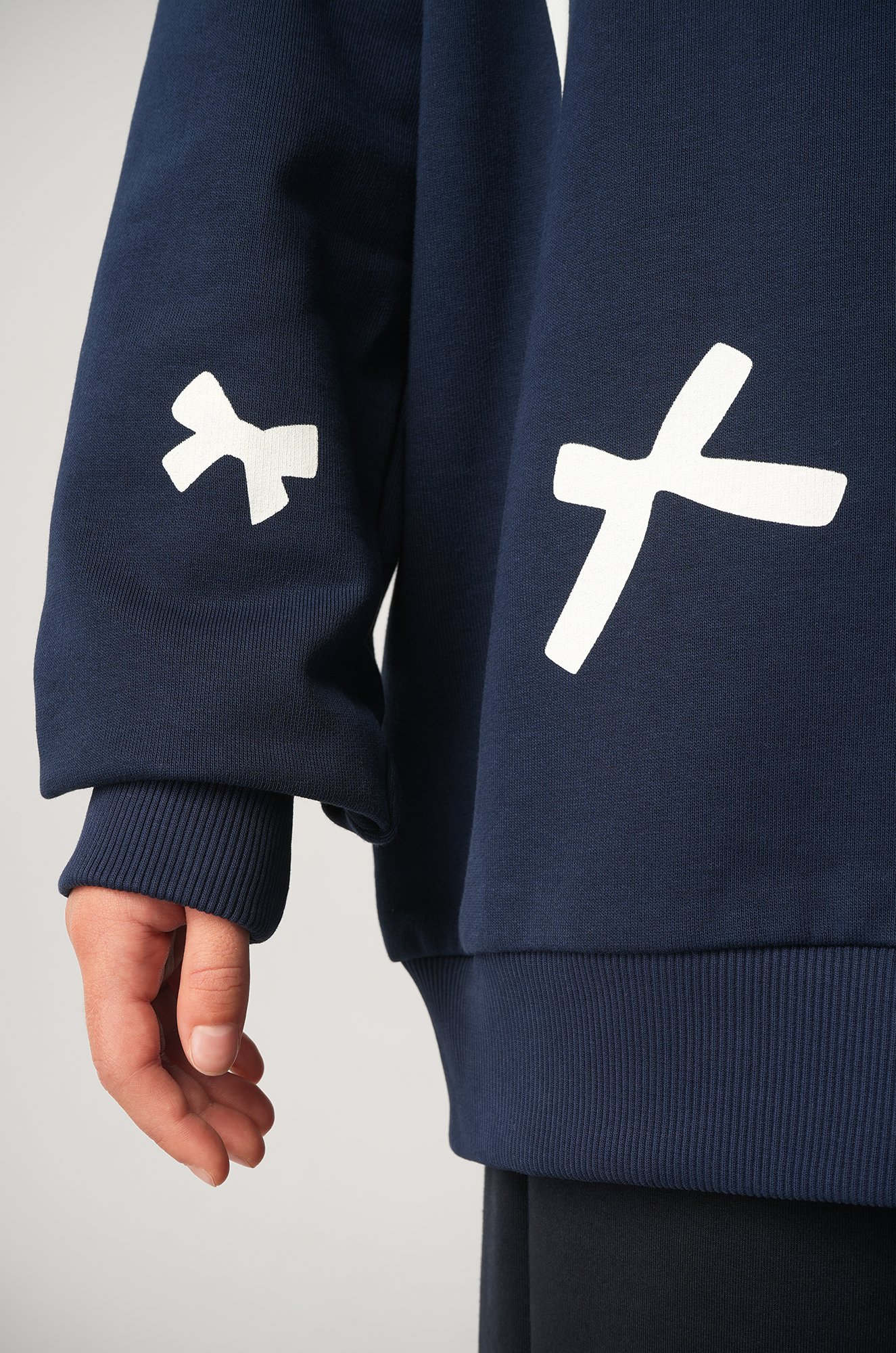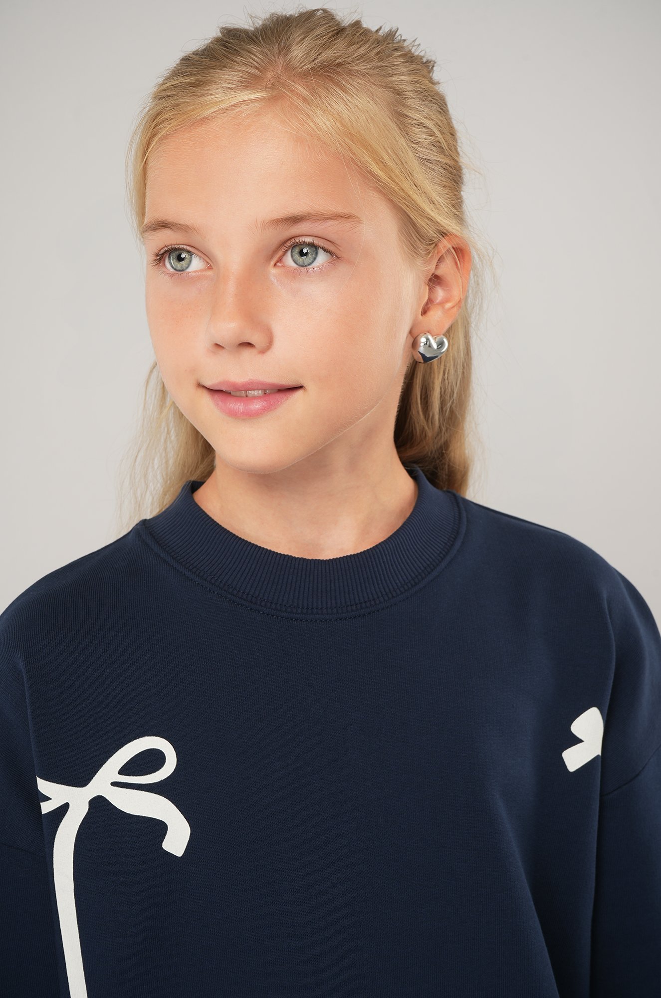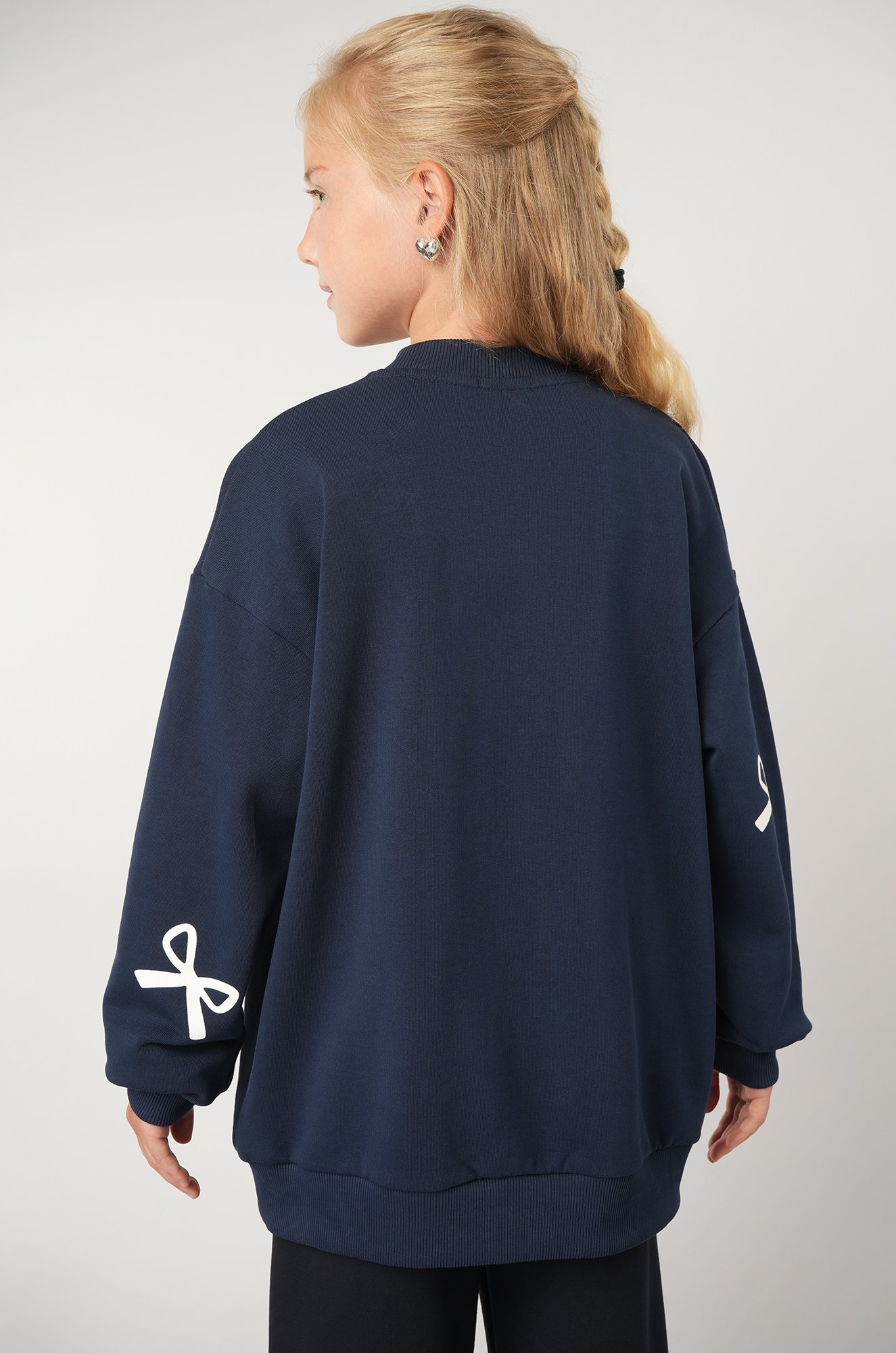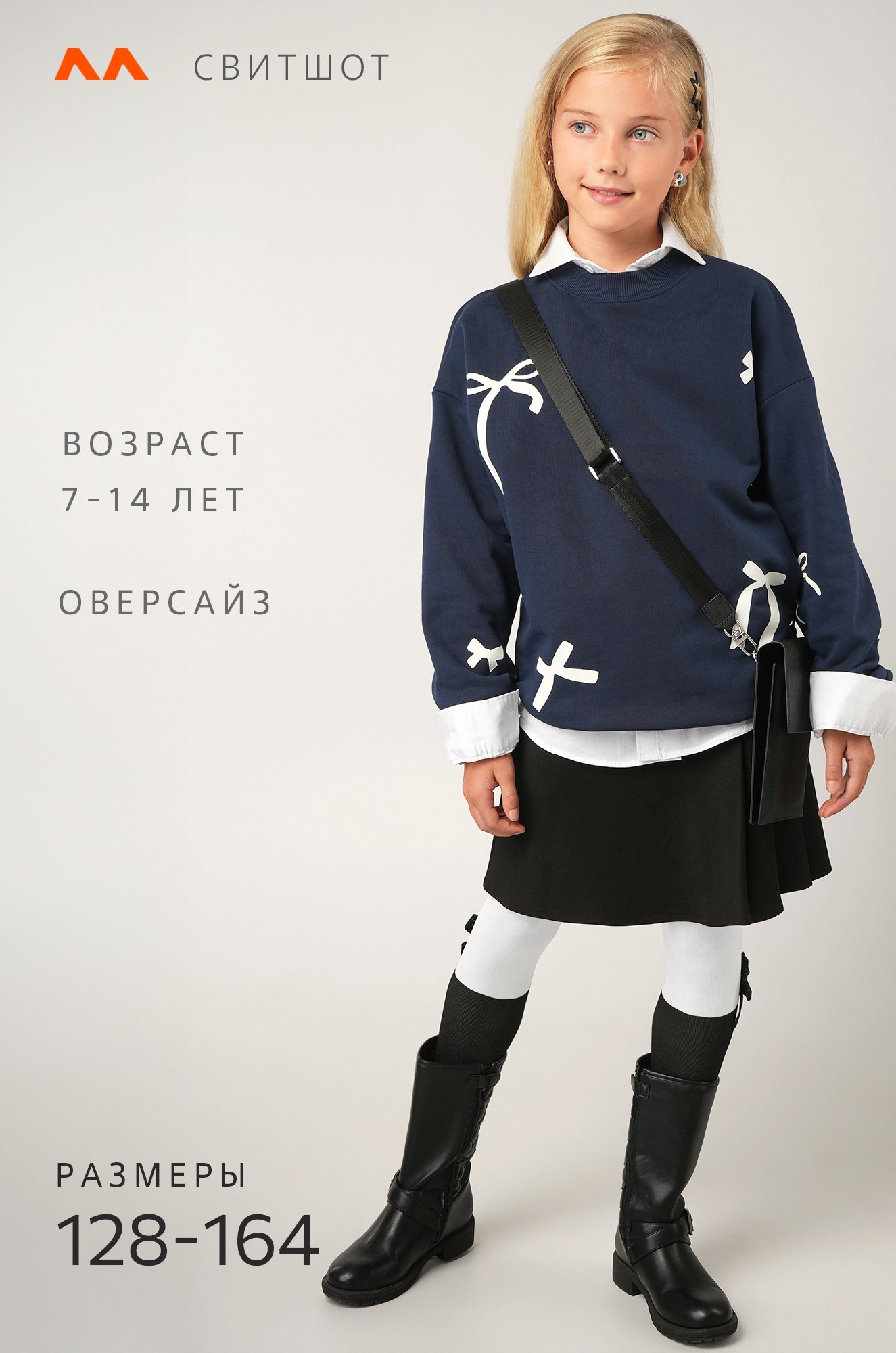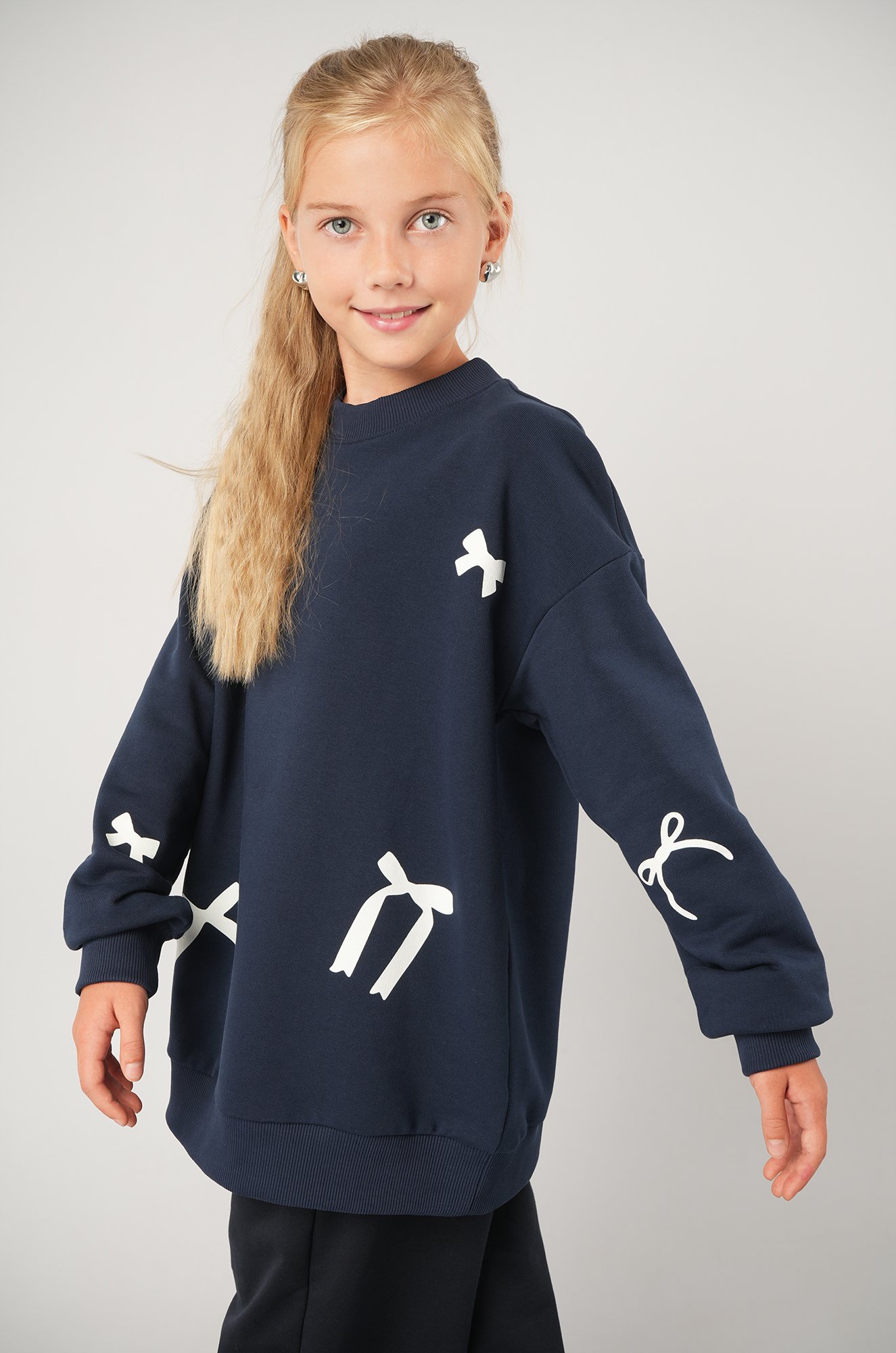 Синий свитшот с принтом бантики — тот самый вариант, который покорит сердце любой девочки! Теплый, стильный и удобный, он станет любимым в гардеробе. Базовый джемпер, который идеально подходит для подростка — прекрасный демисезонный вариант на осень и весну.