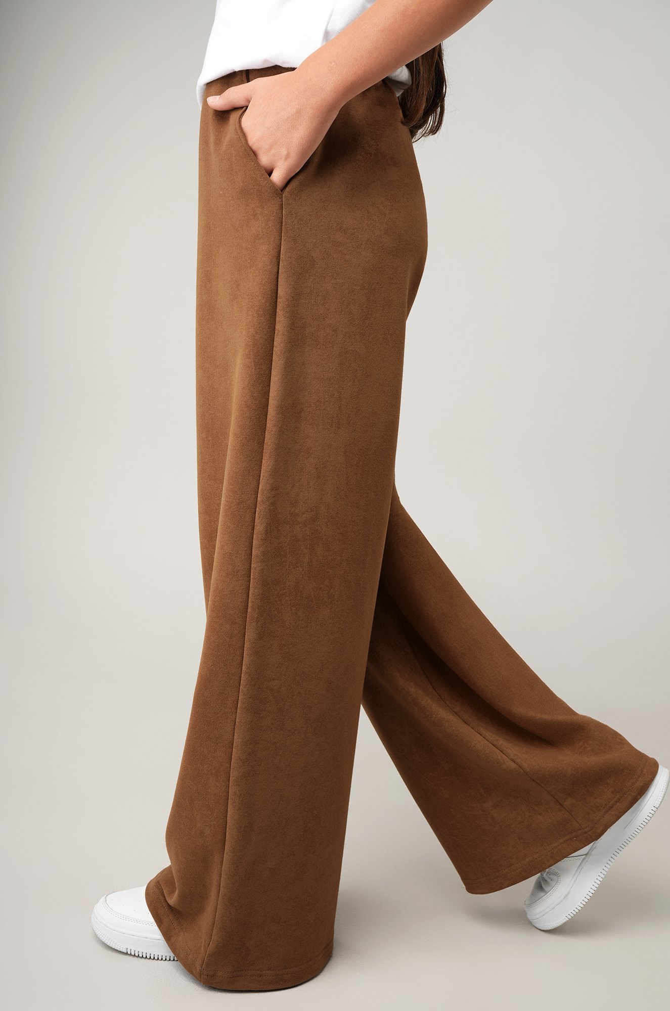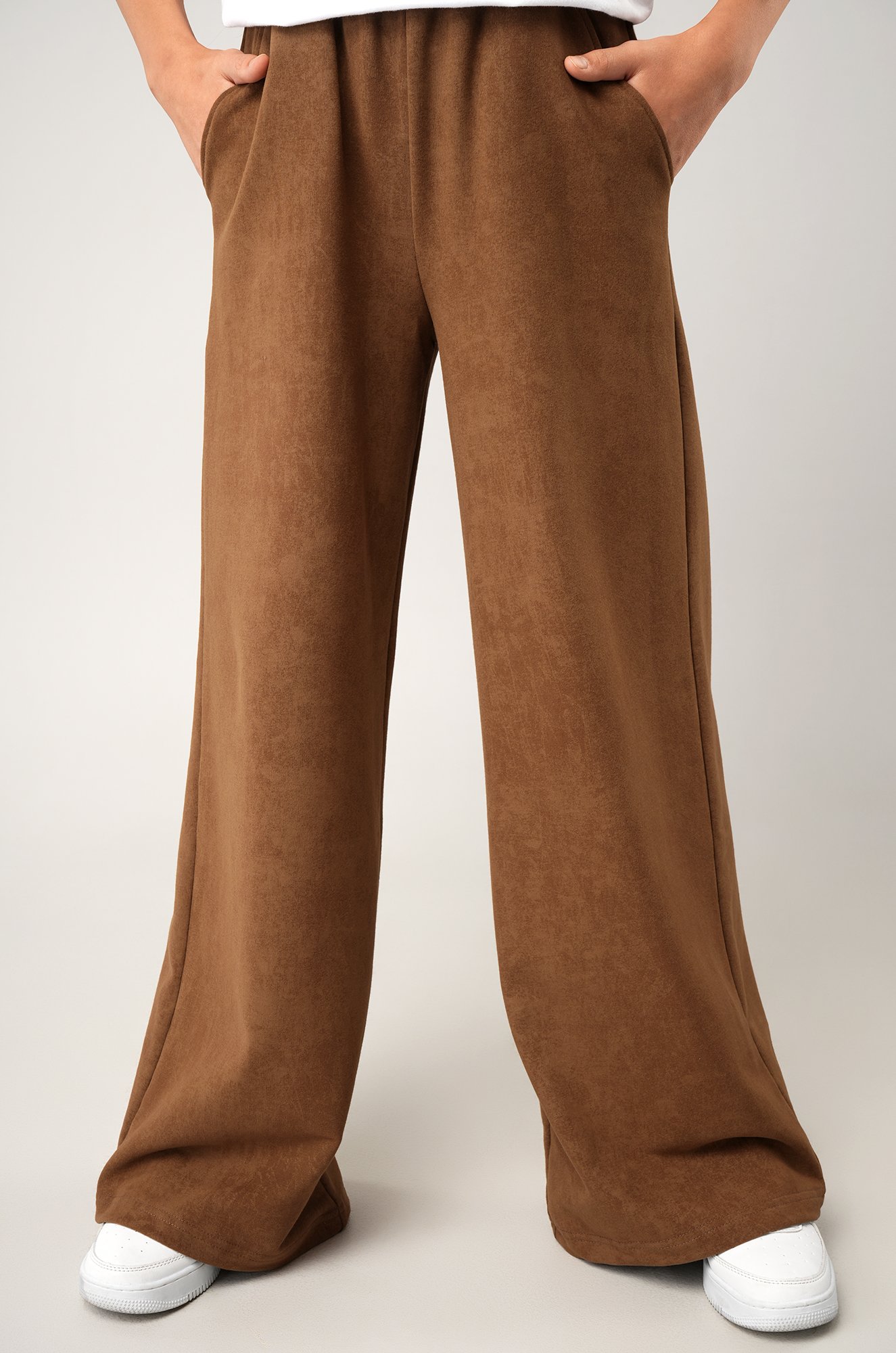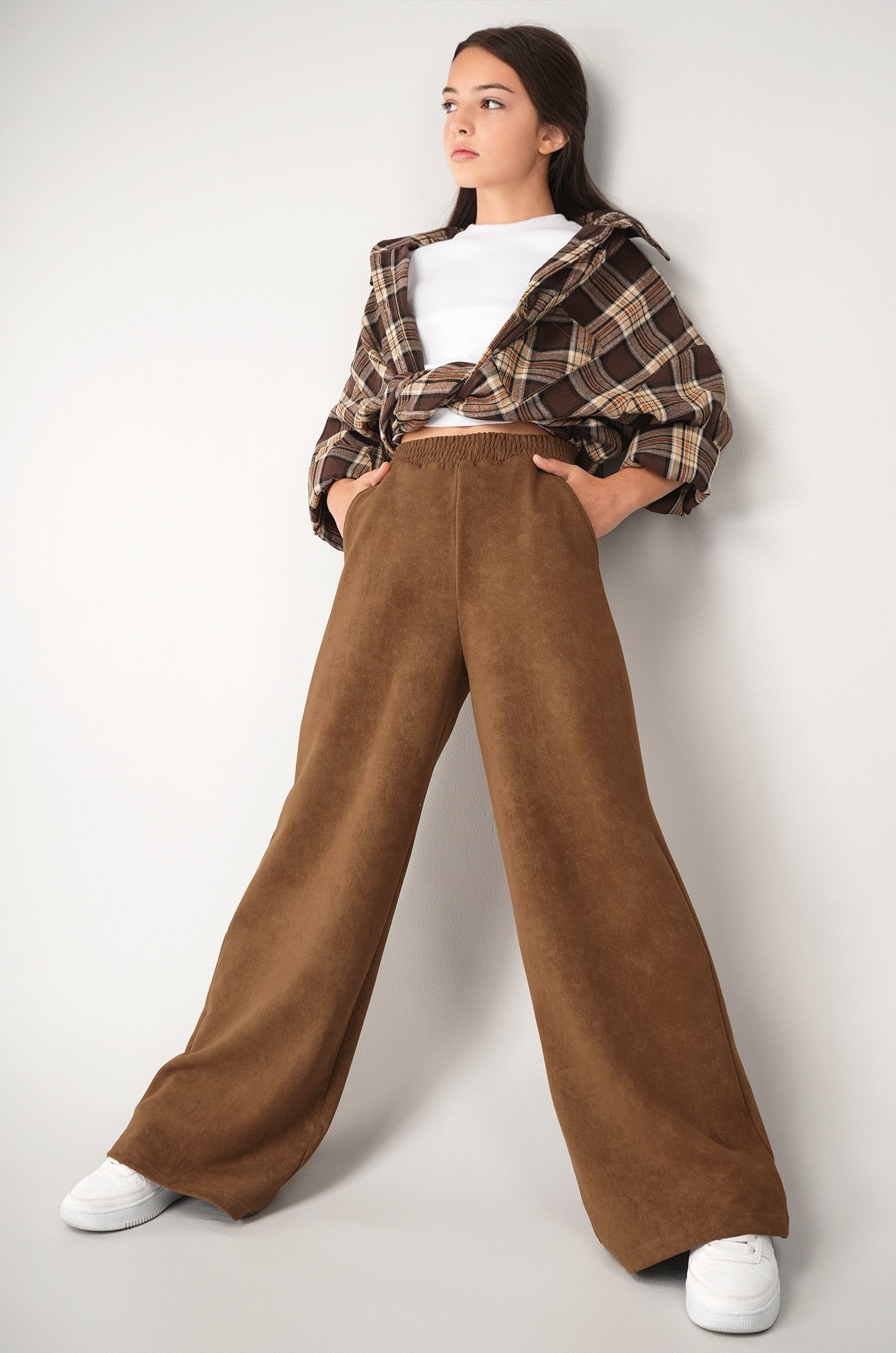 Детские брюки с эффектом варёнка для девочки подростка добавят образу элегантности и свободы. Мягкий хлопковый трикотаж с потертой фактурой добавляет образу оригинальности. Брюки карамельного цвета станут стильным акцентом.