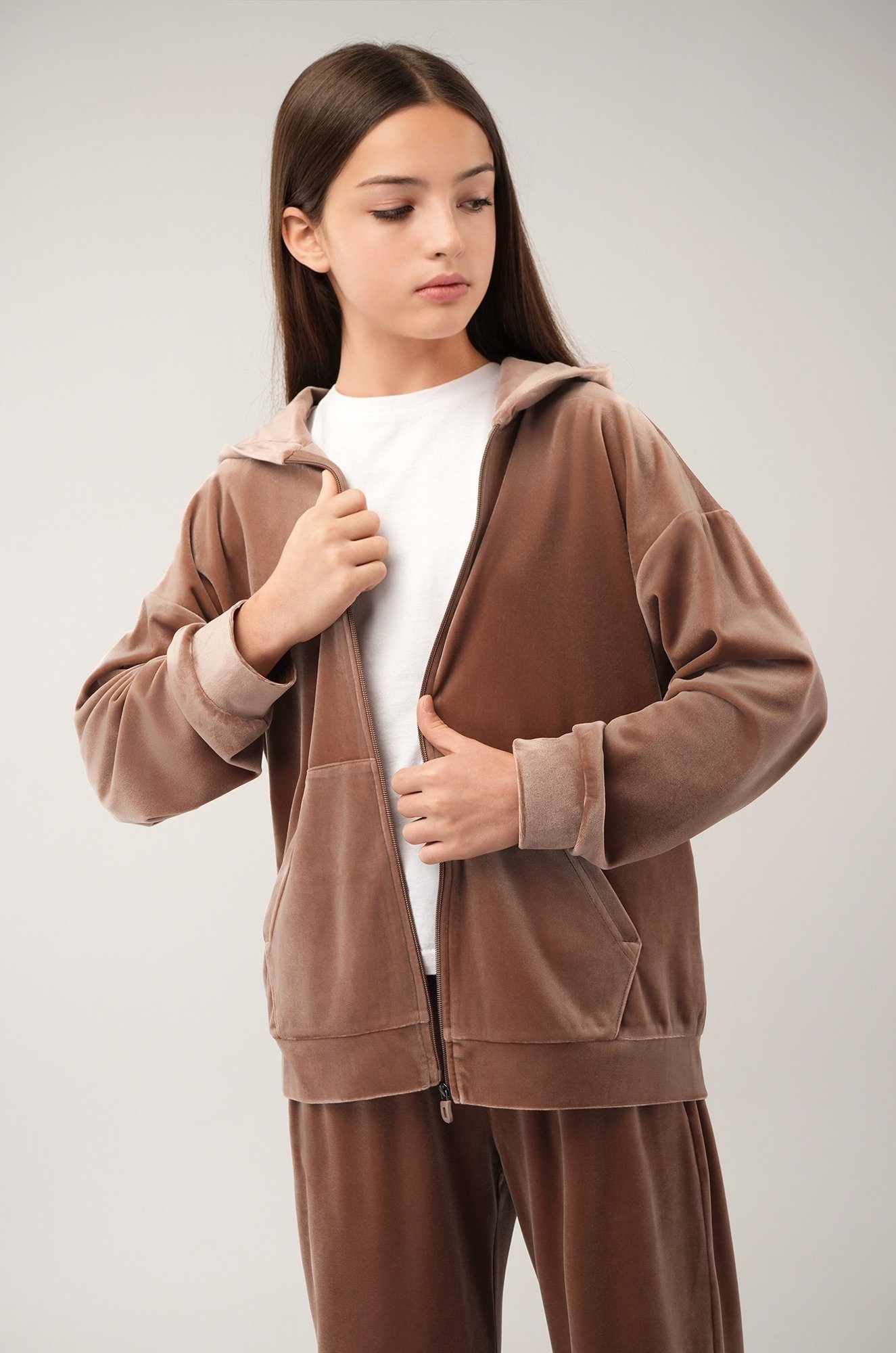 Бежевый костюм для девочки из мягкого трикотажного велюра дарит комфорт и уверенность в движении. Универсальный базовый комплект — отличный выбор для прогулок осенью и весной, отдыха и ярких моментов в спортивном стиле.