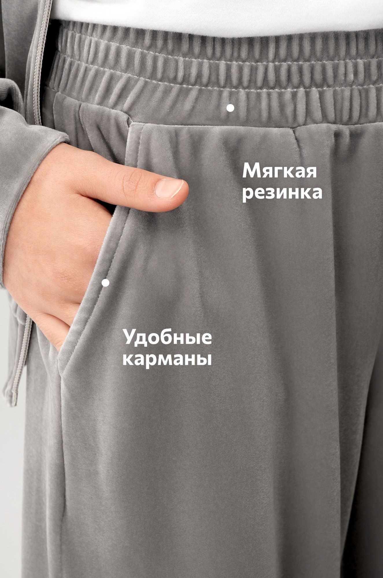 Светло-серый костюм для девочки из мягкого трикотажного велюра дарит комфорт и уверенность в движении. Универсальный базовый комплект — отличный выбор для прогулок осенью и весной, отдыха и ярких моментов в спортивном стиле.