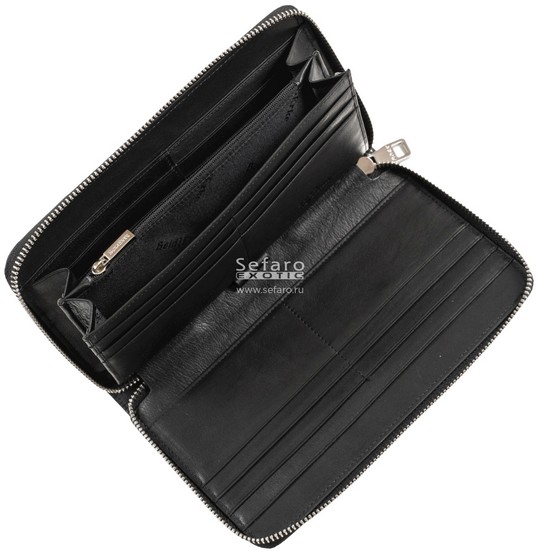 Закрывается на молнию, внутри: 2 отделения для купюр, 1 на молнии - для монет и мелочи, несколько – для кредитных карт или визиток. В комплекте есть боковой кожаный ремешок – удобно носить кошелек на запястье.