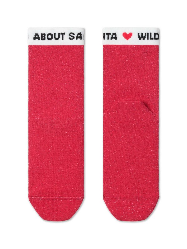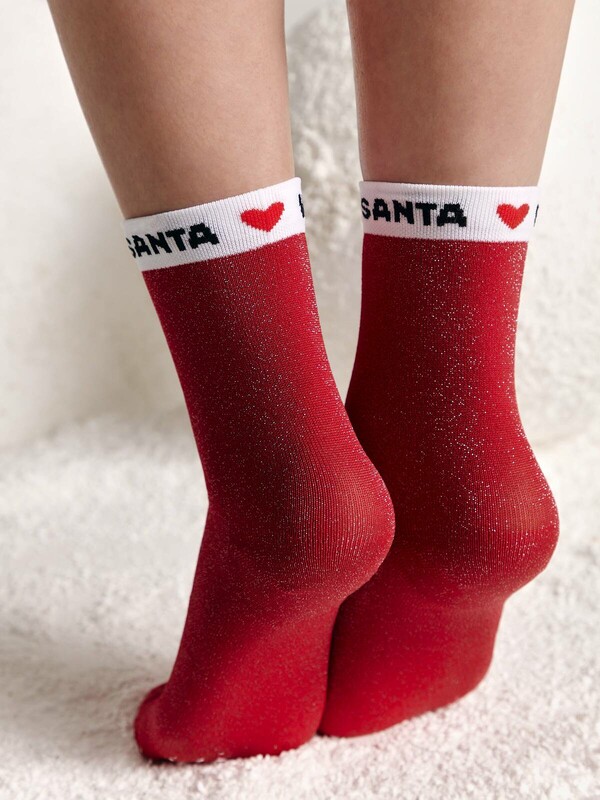 Новогодние носки с люрексом и вывязанной надписью на резнике станут стильным дополнением праздничного образа или оригинальным подарком для девушек, которые любят составлять индивидуальные аутфиты.