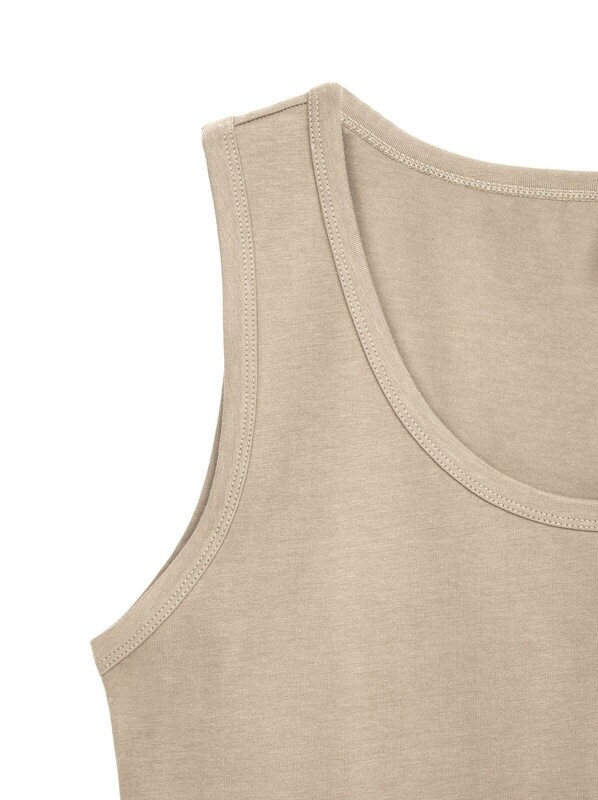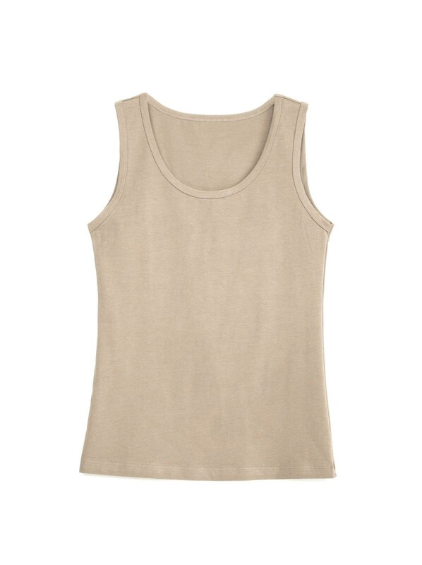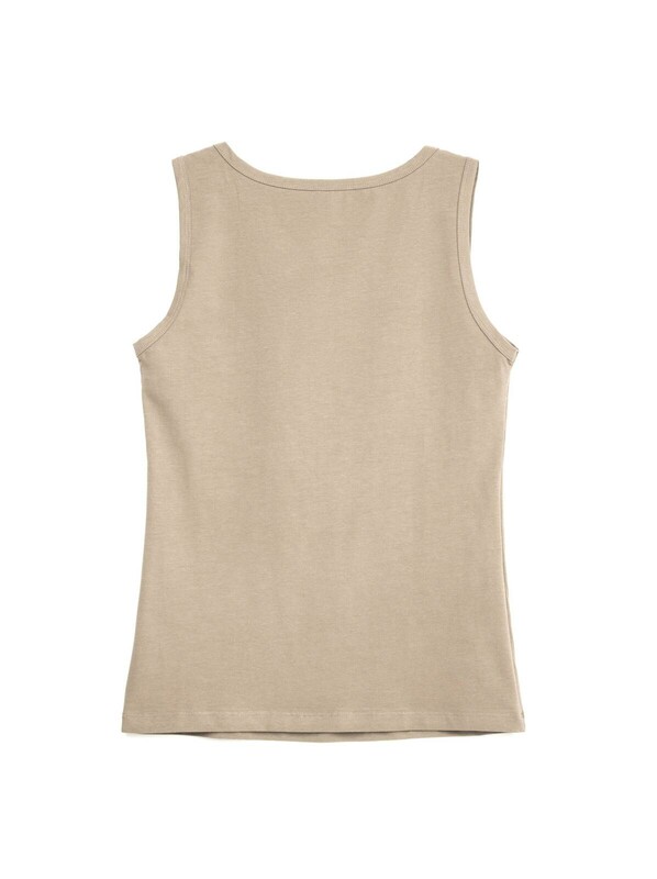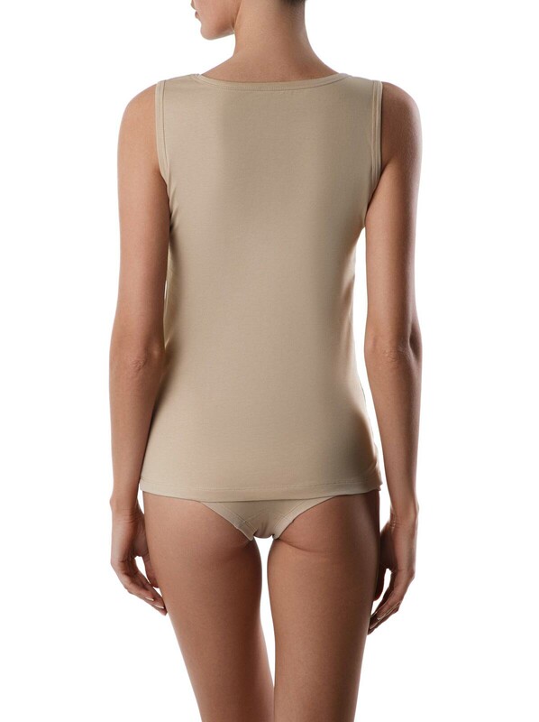 Майка женская бельевая из однотонного трикотажного полотна с глубоким вырезом горловины по переду. Горловина и пройма окантованы бейкой.