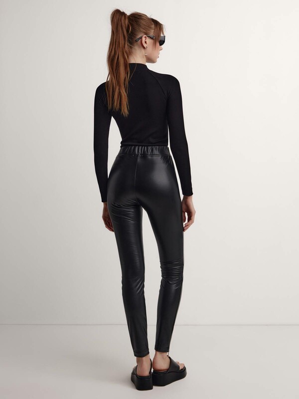 Леггинсы из экокожи на флисе с молниями по низу созданы для свободы самовыражения: эта модель легко встроится в повседневный гардероб, в случае необходимости отлично передаст слегка бунтарское настроение или поддержит стильный деловой образ в сочетании с рубашкой и жакетом. · skinny· высокая посадка· притачной пояс с эластичной тесьмой внутри· по переду выполнены рельефные швы с отделочными строчками· металлические молний по низу· напыление «под кожу»· приятное к телу полотно с согревающим слоем флиса· сохранение формы и цвета при соблюдении рекомендаций по уходу· созданы, чтобы стать основной для множества стильных образов. полиэстер 93%, эластан 7%