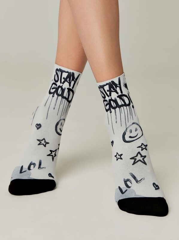 Плотные носки с особенно устойчивым рисунком, нанесенным с помощью термотрансферной печати, станут стильным и индивидуальным акцентом в повседневных образах. Термотрансферная печать - процесс, при котором специальная краска на бумажном носителе резко нагревается, переходит из твердого состояния в газообразное и переносится с бумаги на носки, глубоко проникая в волокна и создавая устойчивое изображение. · 70 den· плотные и эластичные· рисунок, нанесенный с помощью термотрасферной печати· использование черной полиамидной нити для контрастности рисунка· мысок выделен черной полиамидной нитью· эффект 3D· c бортом· без пятки· стиль начинается с индивидуальности. полиэстер 45%, полиамид 41%, эластан 14%