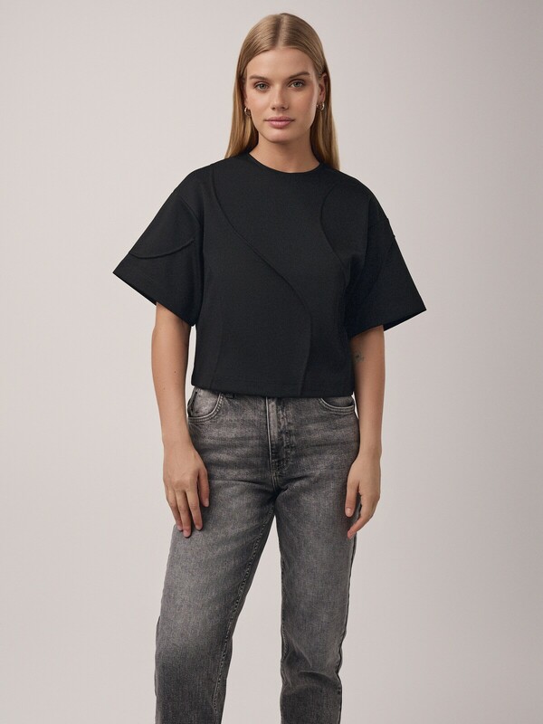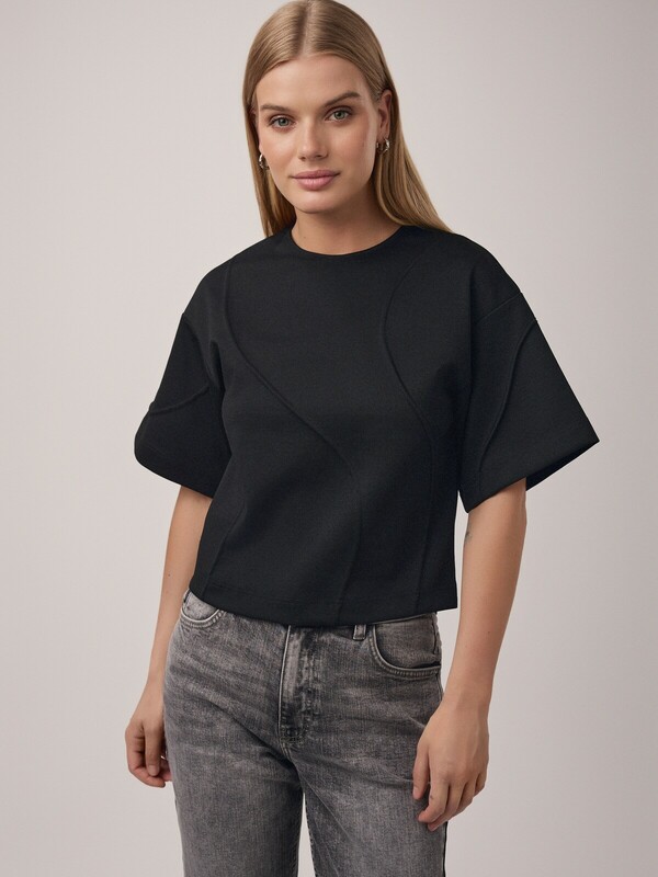 Укороченная футболка из фактурного костюмного полотна станет лаконичной основной для повседневных образов, поможет создавать актуальные деловые аутфиты, а при должной стилизации выступит в роли модели для вечернего выхода в свет.