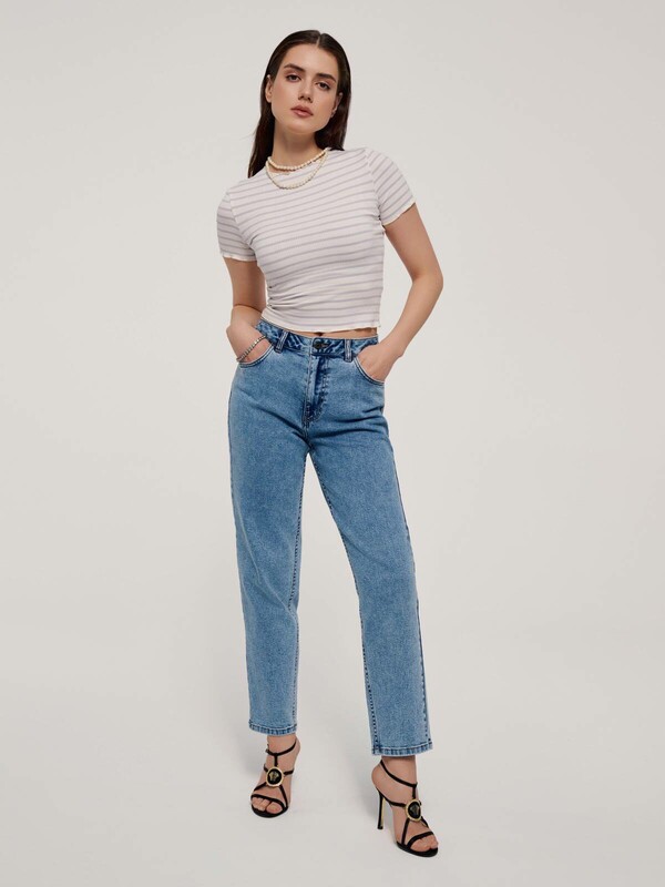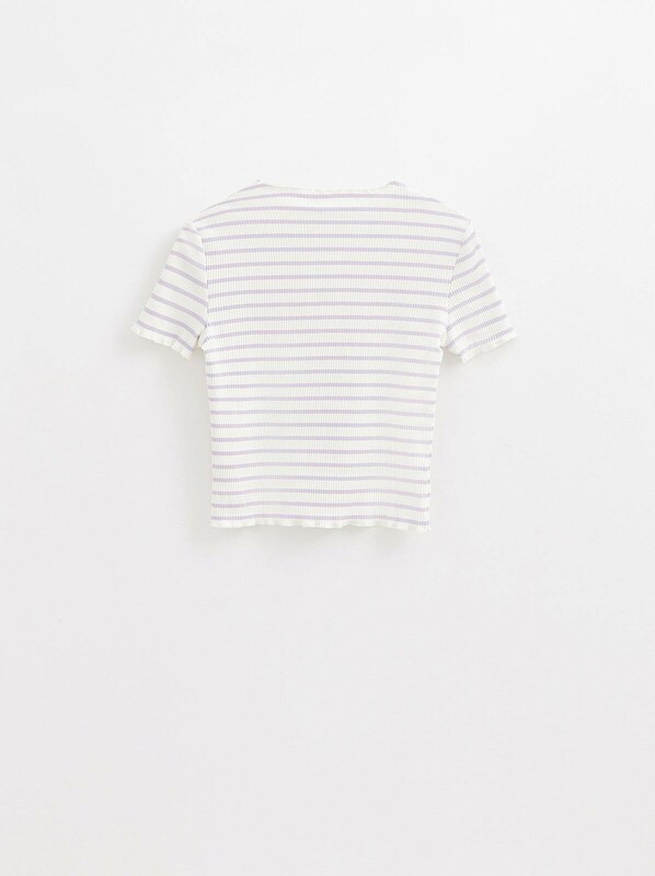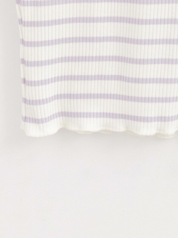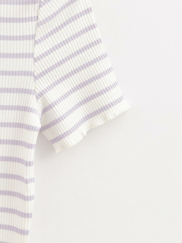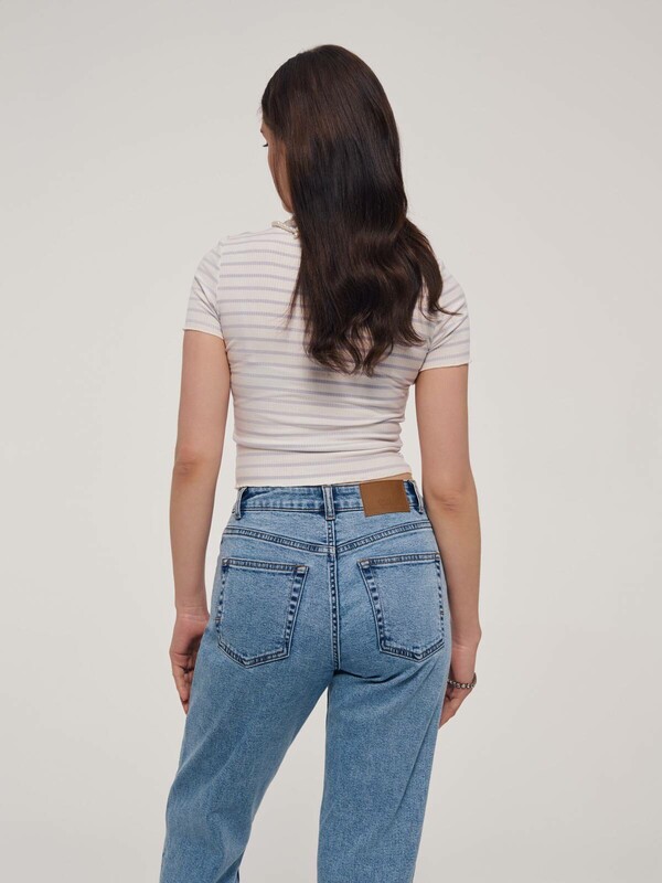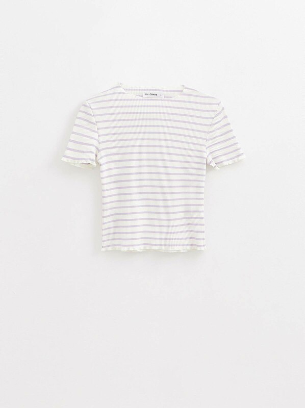 Прилегающая футболка в рубчик с обработкой "бэбилок" по рукавам и низу поможет создать лаконичный, но при этом индивидуальный образ.