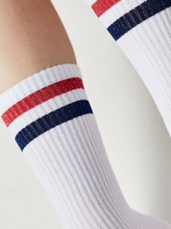 Хлопковые носки с яркими полосками из люрекса смотрятся так стильно и оригинально, что вам не захочется прятать их под одеждой. Смело носите трендовые носочки ACTIVE в стиле спорт-шик и с удовольствием подчеркивайте свою индивидуальность.