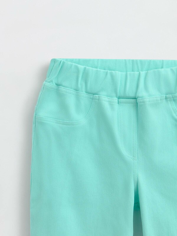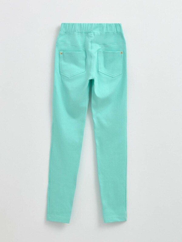 Леггинсы женские, облегающие из однотонного трикотажного полотна. По переду имитация гульфика и боковых карманов. По спинке кокетки и накладные карманы. Верх изделия обработан поясом с эластичной тесьмой внутри. По правому переднему шву нашиты аппликации в виде бабочек.