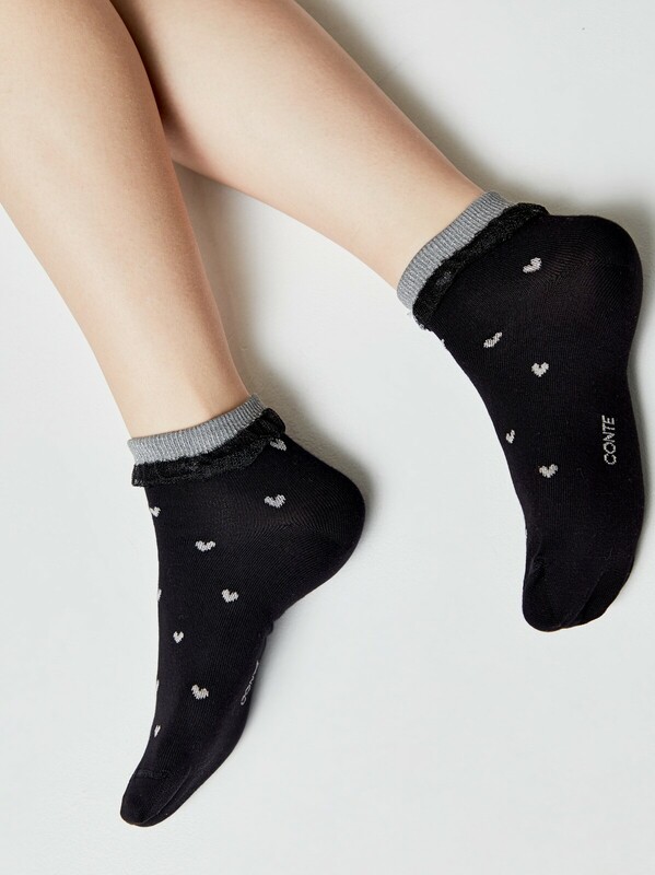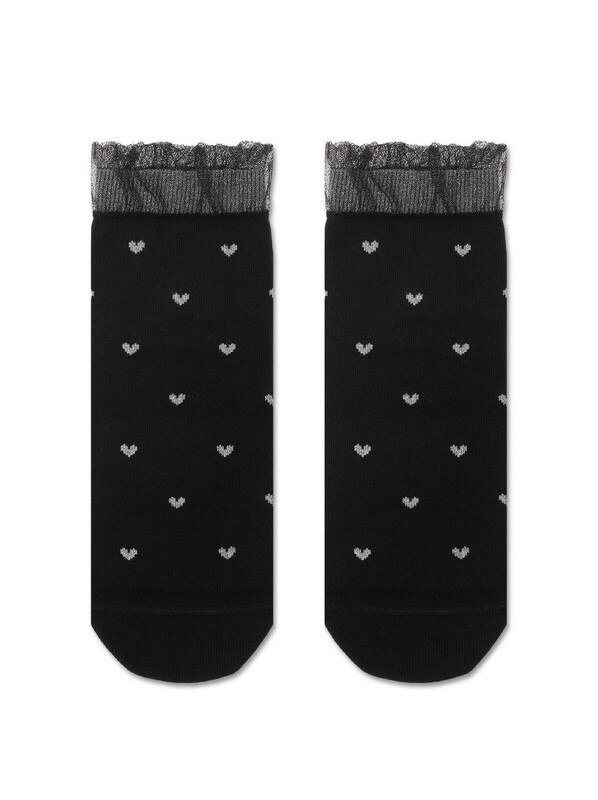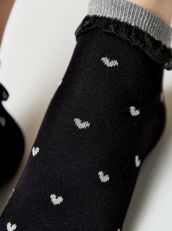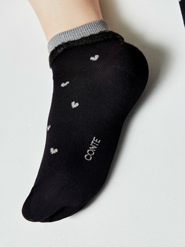 Хлопковые носки с воздушным бортом и сердечками из нитей люрекса созданы, чтобы расставлять оригинальные акценты в повседневном и спортивном образе.