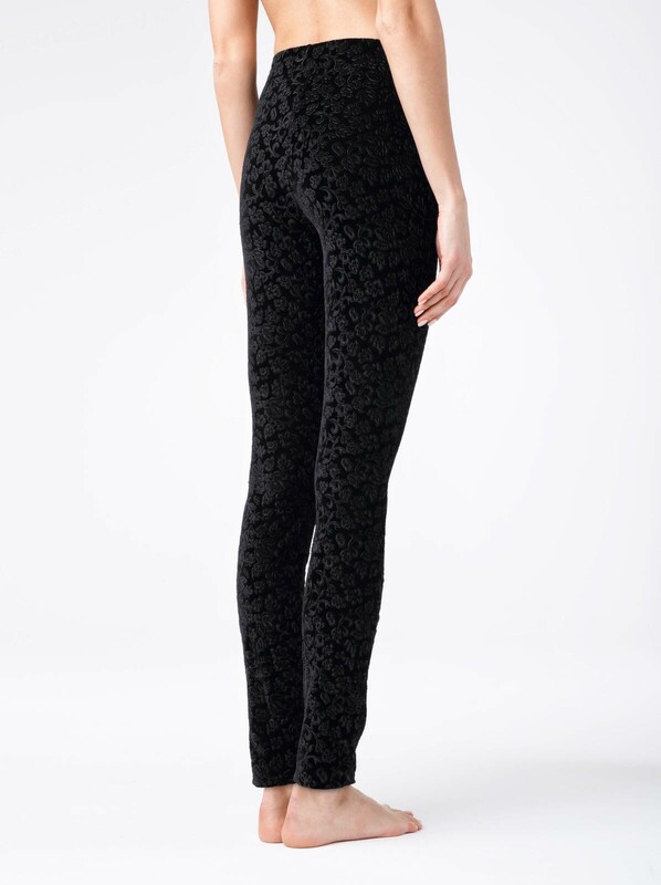 Леггинсы женские облегающие, без боковых швов, из бархатного трикотажного полотна. Верх изделия обработан широким поясом с широкой резинкой внутри.