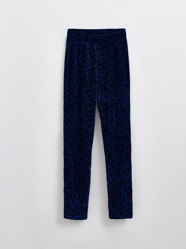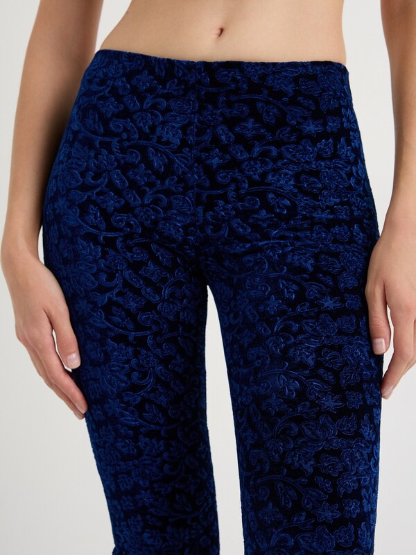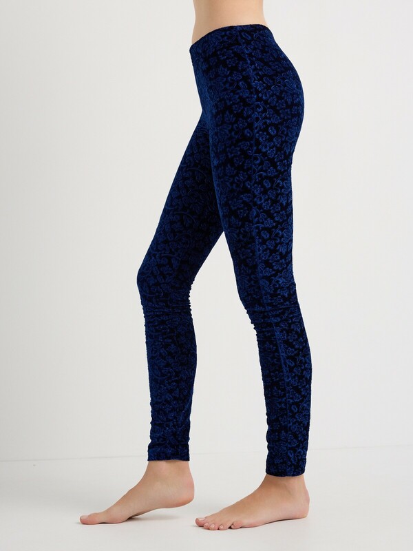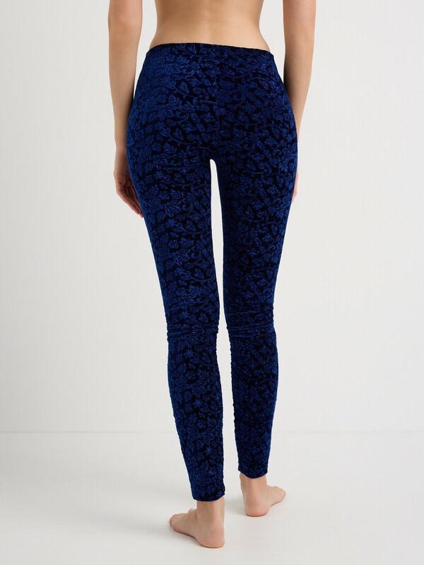 Леггинсы женские облегающие, без боковых швов, из бархатного трикотажного полотна. Верх изделия обработан широким поясом с широкой резинкой внутри.