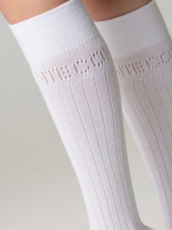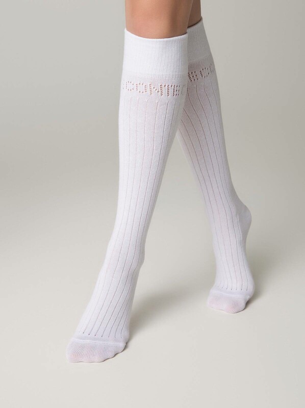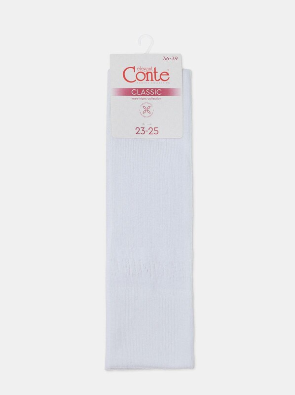 Гольфы из хлопка в рубчик с ажурной надписью «Сonte» станут финальным штрихом стильного образа. Гольфы мягкие, тактильно приятные, плотно облегают ногу и не сползают благодаря эластичной широкой резинке.