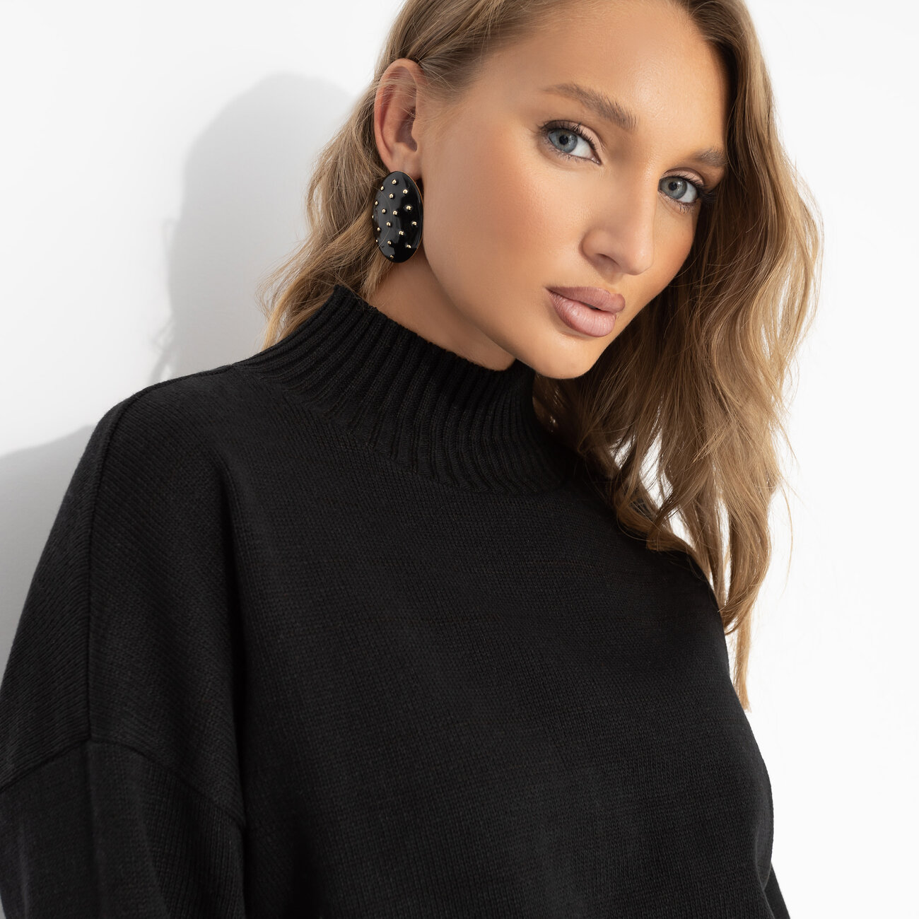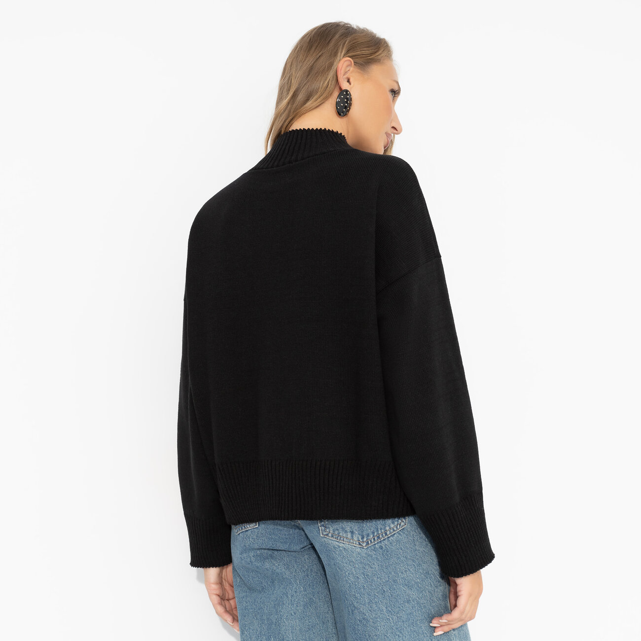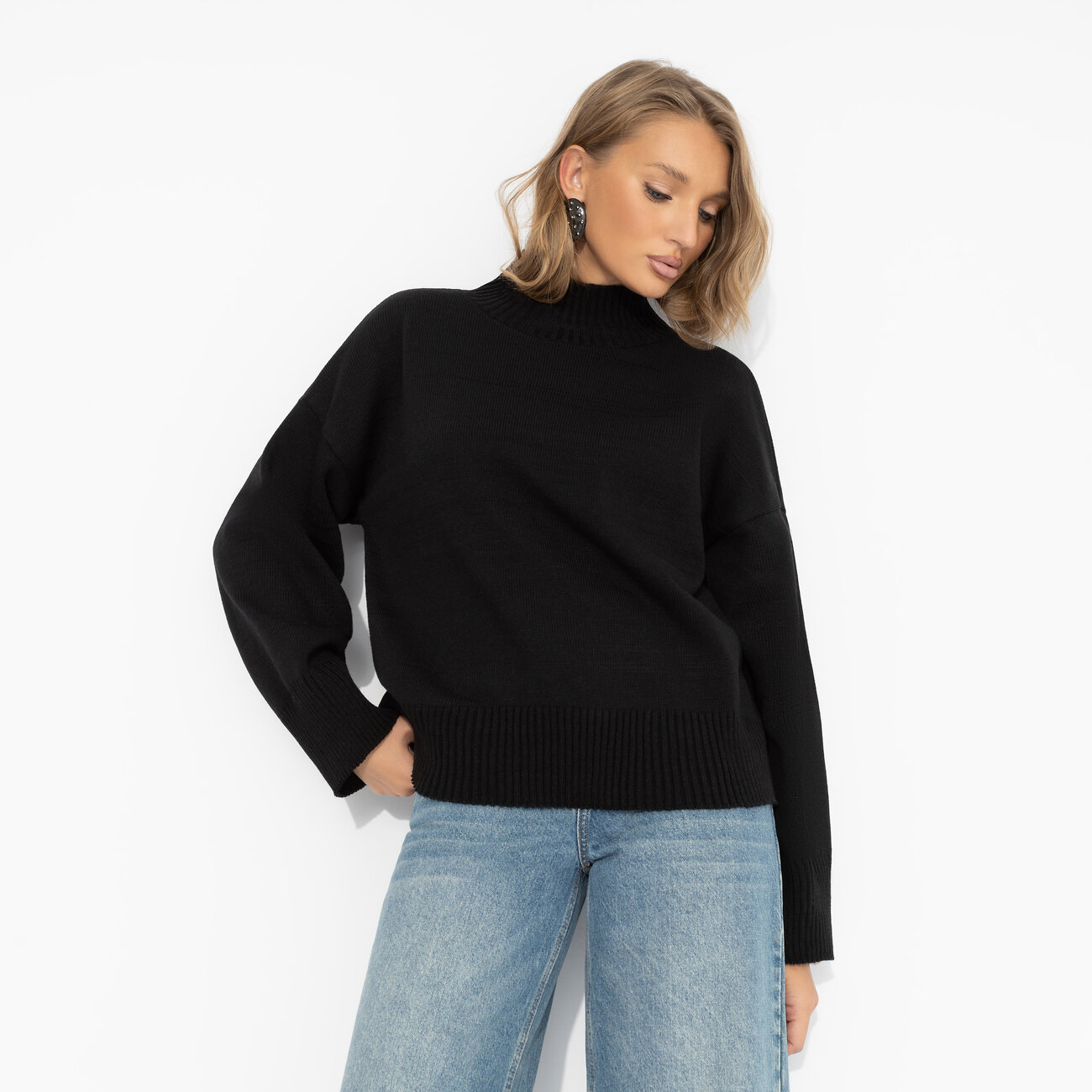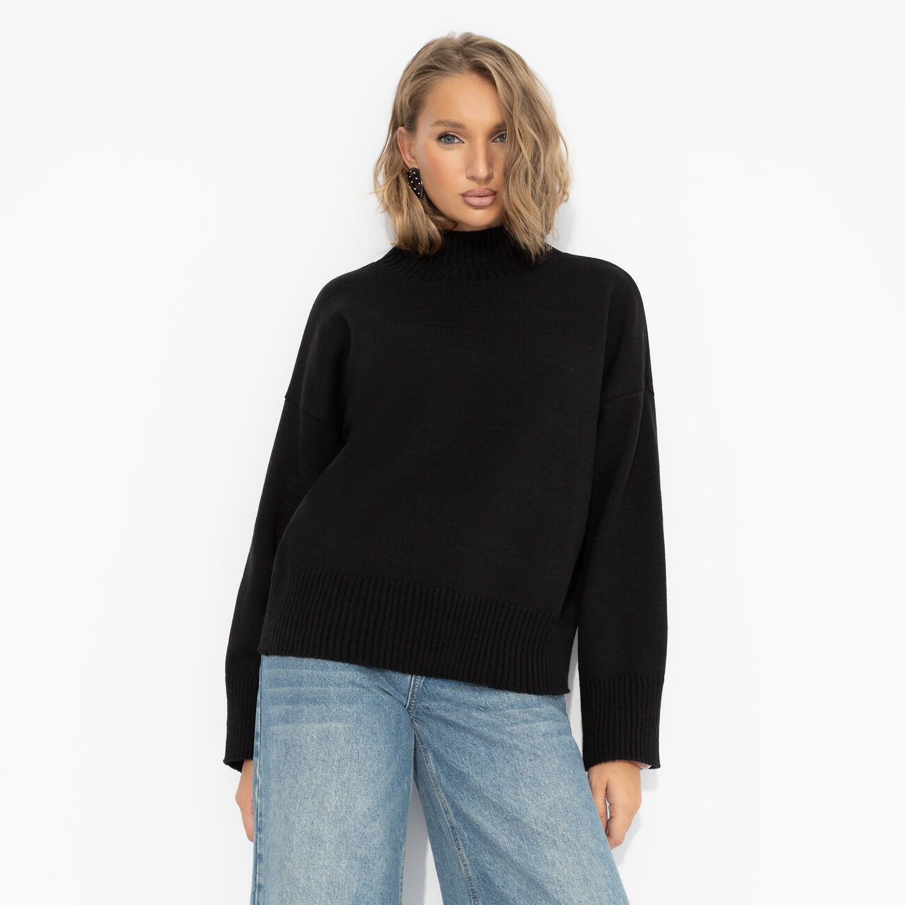 Базовый чёрный – когда ты создешь стиль без усилий. Уютная вязка и мягкая шерсть для максимального комфорта в образе на каждый день. Простая форма + мощная энергия – идеальное комбо. Джемпер с высоким воротником из вязаного трикотажа с добавлением шерстяной нити.