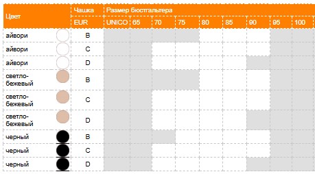 | Цвет | Чашка | Размер бюстгальтера | |||||||||||||