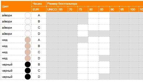 | Цвет | Чашка | Размер бюстгальтера | |||||||||||||