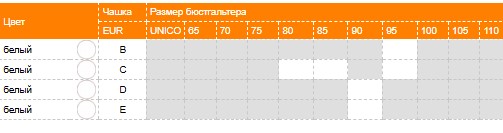 | Цвет | Чашка | Размер бюстгальтера | |||||||||||||
