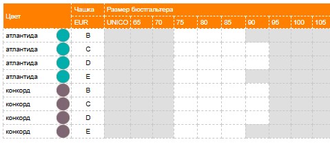 | Цвет | Чашка | Размер бюстгальтера | |||||||||||||