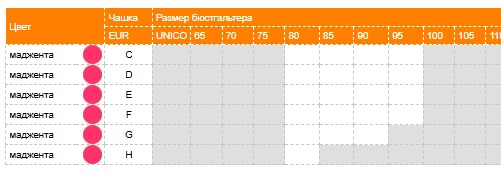 | Цвет | Чашка | Размер бюстгальтера | |||||||||||||
