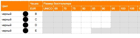 | Цвет | Чашка | Размер бюстгальтера | |||||||||||||