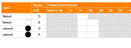 | Цвет | Чашка | Размер бюстгальтера | |||||||||||||