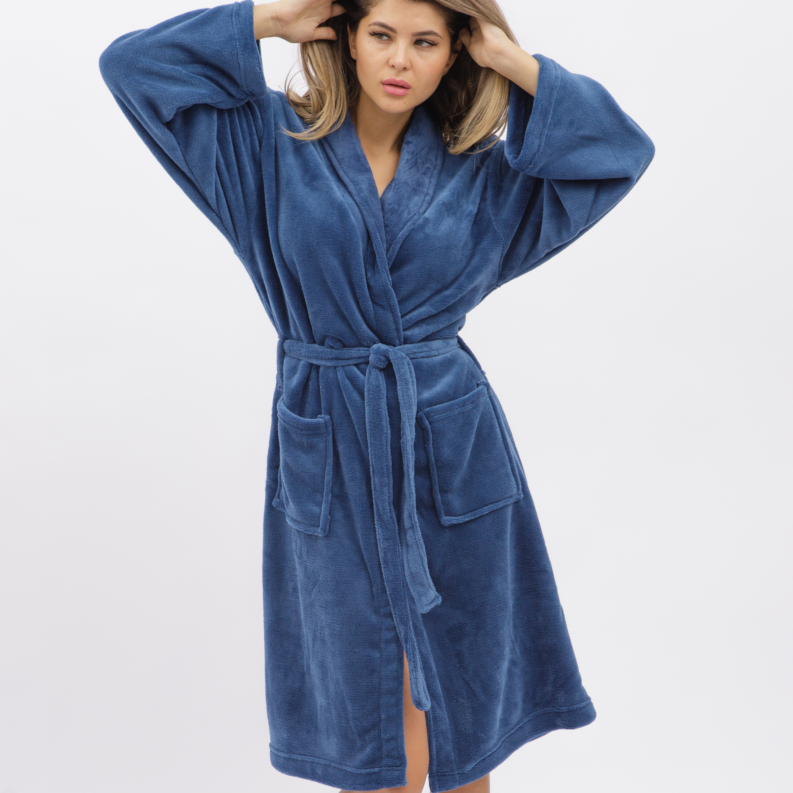 Халат домашний женский с длинными рукавами и накладными карманами. Шалевый воротник. Завязывается на пояс. Длина ниже колена.
