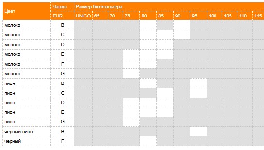 Цвет Чашка Размер бюстгальтера EUR UNICO 65 70 75 80 85 90 95 100 105 110 115 120 молоко C молоко D молоко F молоко G пион B пион C пион D пион E т