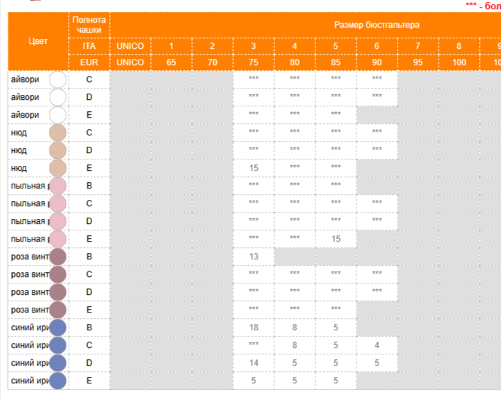 | Цвет | Чашка | Размер бюстгальтера | |||||||||||||
