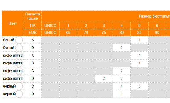 | Цвет | Чашка | Размер бюстгальтера | |||||||||||||