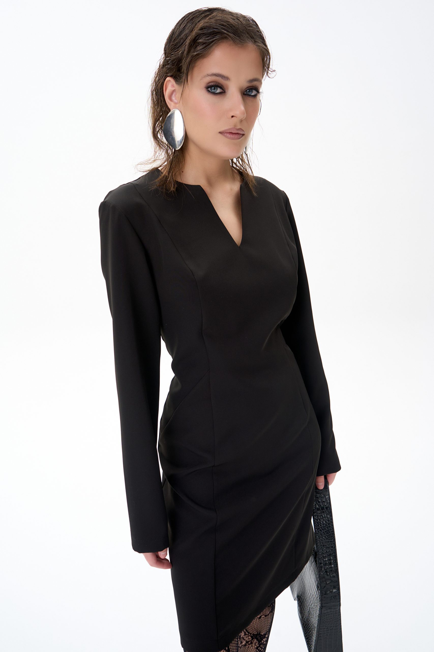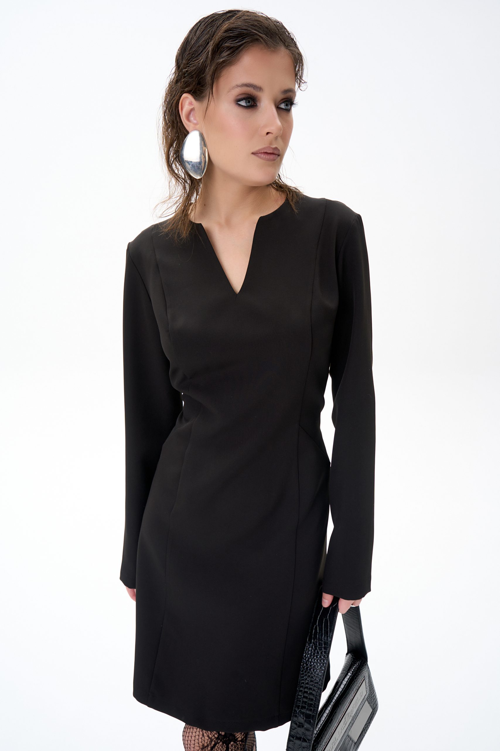 Горловина: V-образный вырез, аккуратно обработан обтачкой, сохраняет форму и визуально вытягивает линию шеи.