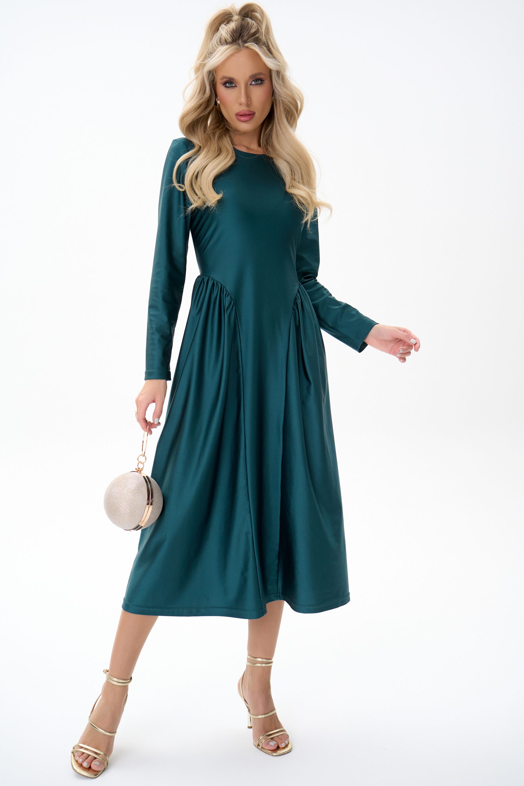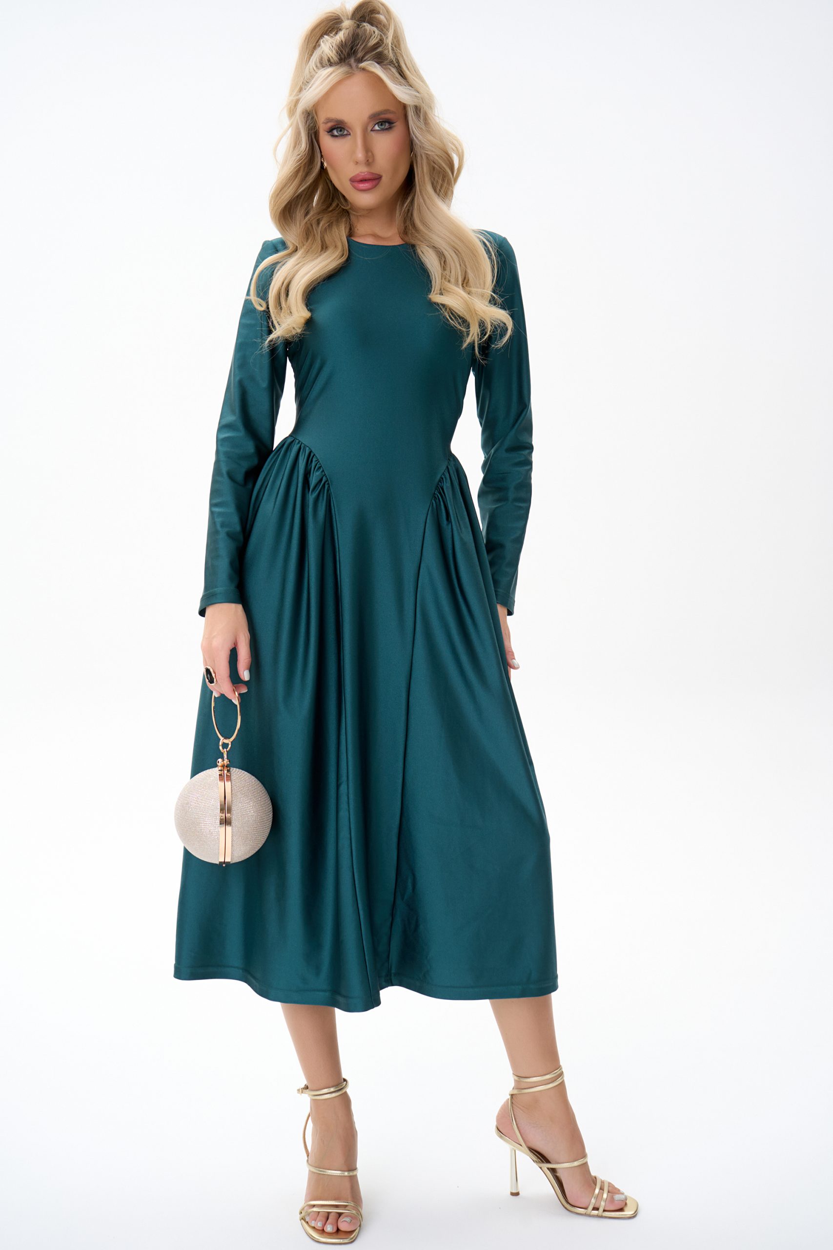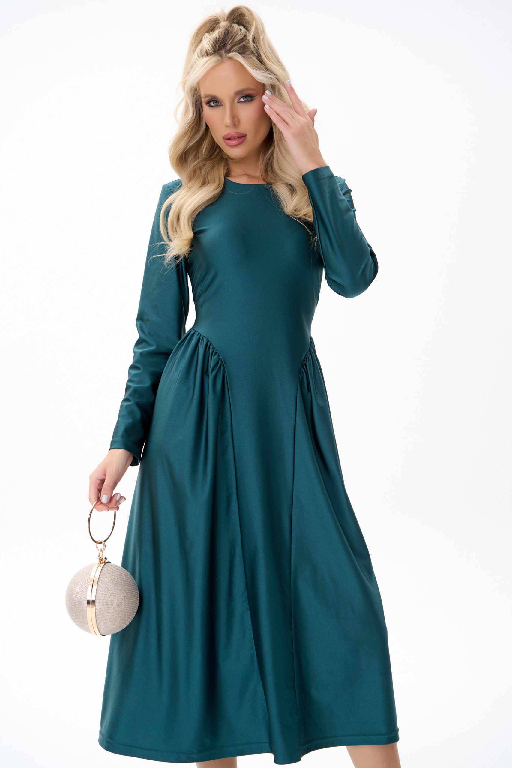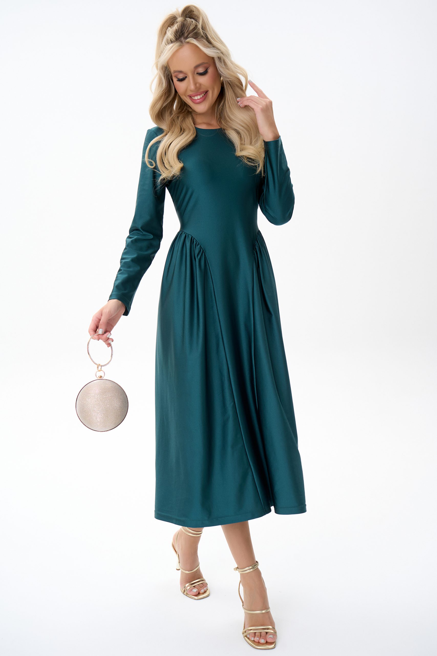 Платье «Донна» — универсальная модель в двух оттенках: классический чёрный и благородный изумруд. Элегантное миди-платье с завышенной линией талии и идеально гладкой посадкой лифа. Мягкие боковые сборки создают красивый объём юбки и подчёркивают женственный силуэт. Плотный эластичный материал с лёгким сатиновым блеском комфортно тянется и плавно драпируется. Лаконичная круглая горловина и длинный рукав делают модель подходящей как для рабочих будней, так и для мероприятий, ужинов и фотосъёмок. Платье смотрится дорого и подчёркивает фигуру без лишних деталей.