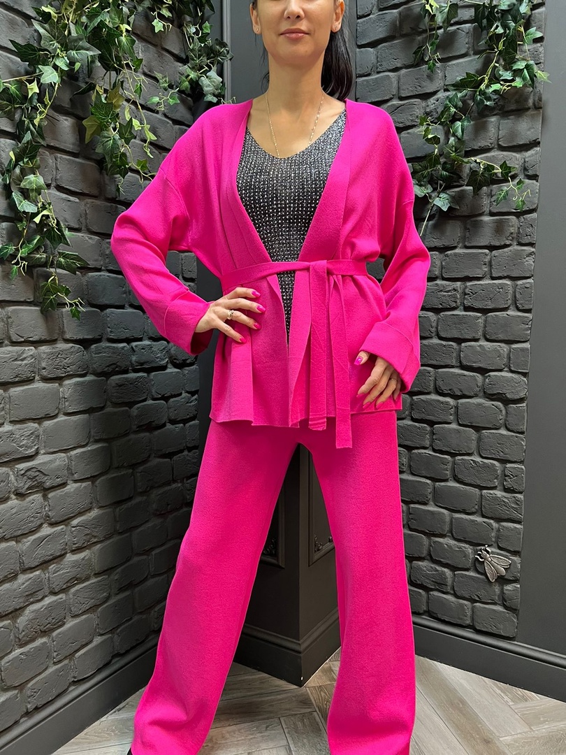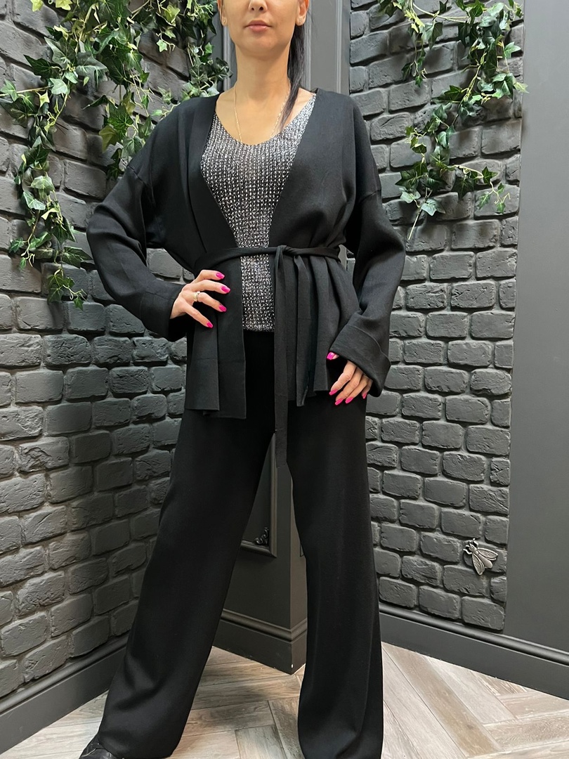 широкие брюки полная длин кардиган типо кимоно с поясом