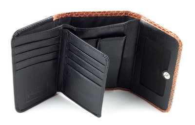 Кошелек женский из натуральной кожи змеи. Раскрывается на 3 створки, 1 отделение для купюр, 8 отделений для визитных и кредитных карт, 1 отделения-окошко для фотографий/пропуска, 3 отделения для прочих документов, внутри 1 отделение для монет на кнопке.Застежка - магнитная кнопка.Все детали внутренней отделки кошелька выполнены из высококачественной телячьей кожи.