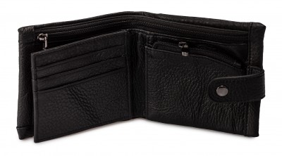 Раскрывается на 2 створки, горизонтальная ориентация. Закрывается на хлястик с кнопкой. Внутри: 2 отделения для купюр одно из которых на молнии, 9 отделений для кредитных карт, 1 отделение для сим карт, 1 карман на молнии. Снаружи: 1 карман на молнии и 1 потайной карман.