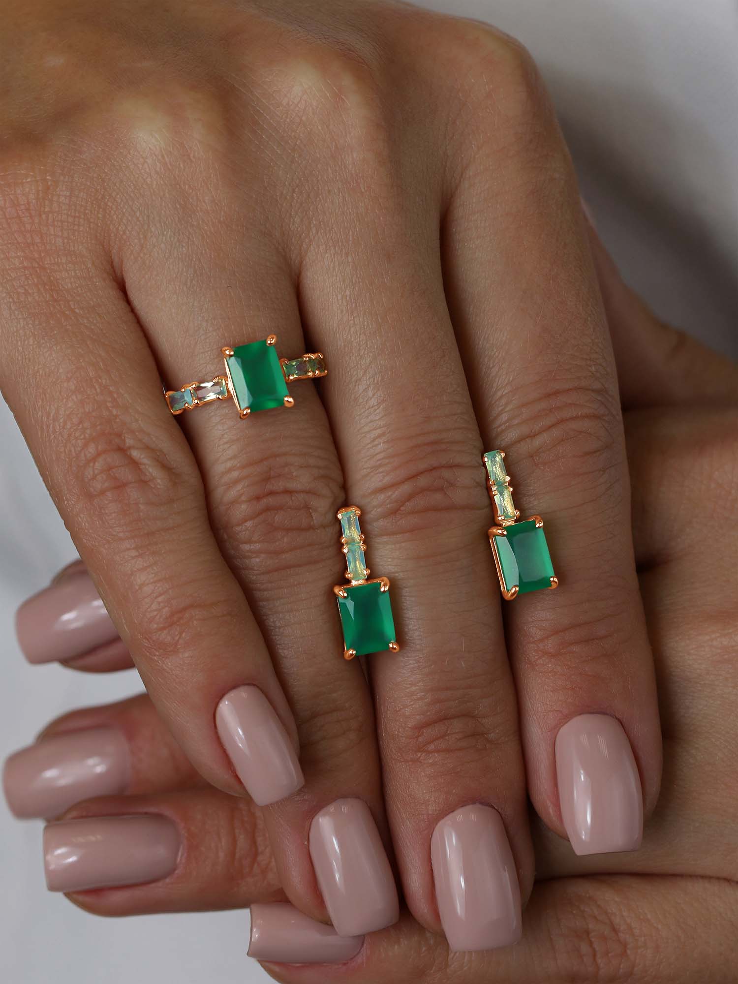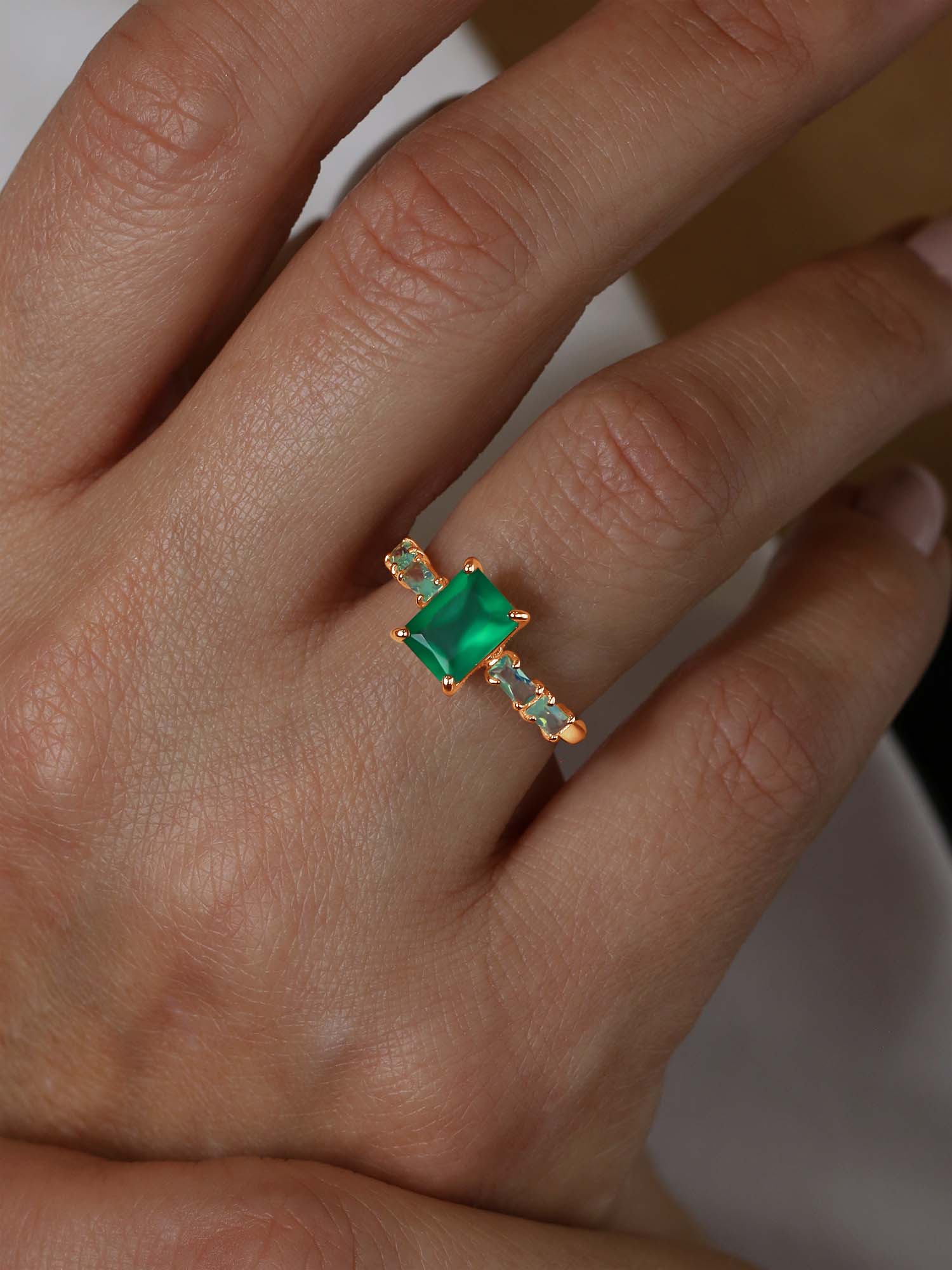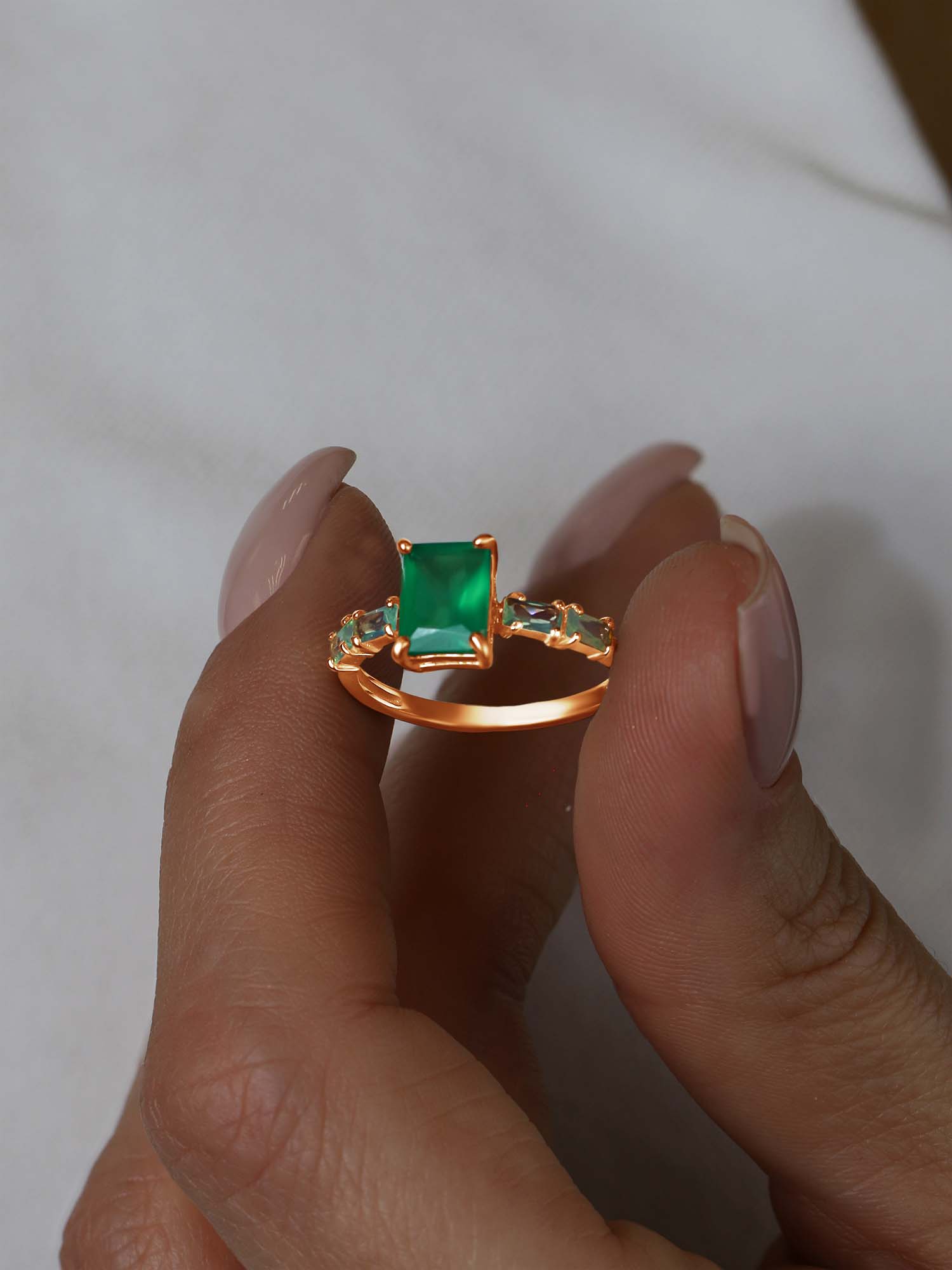 Кольцо из золочёного серебра с агатом и плавленым мятным кварцем 925 пробы к-00241з-46132
