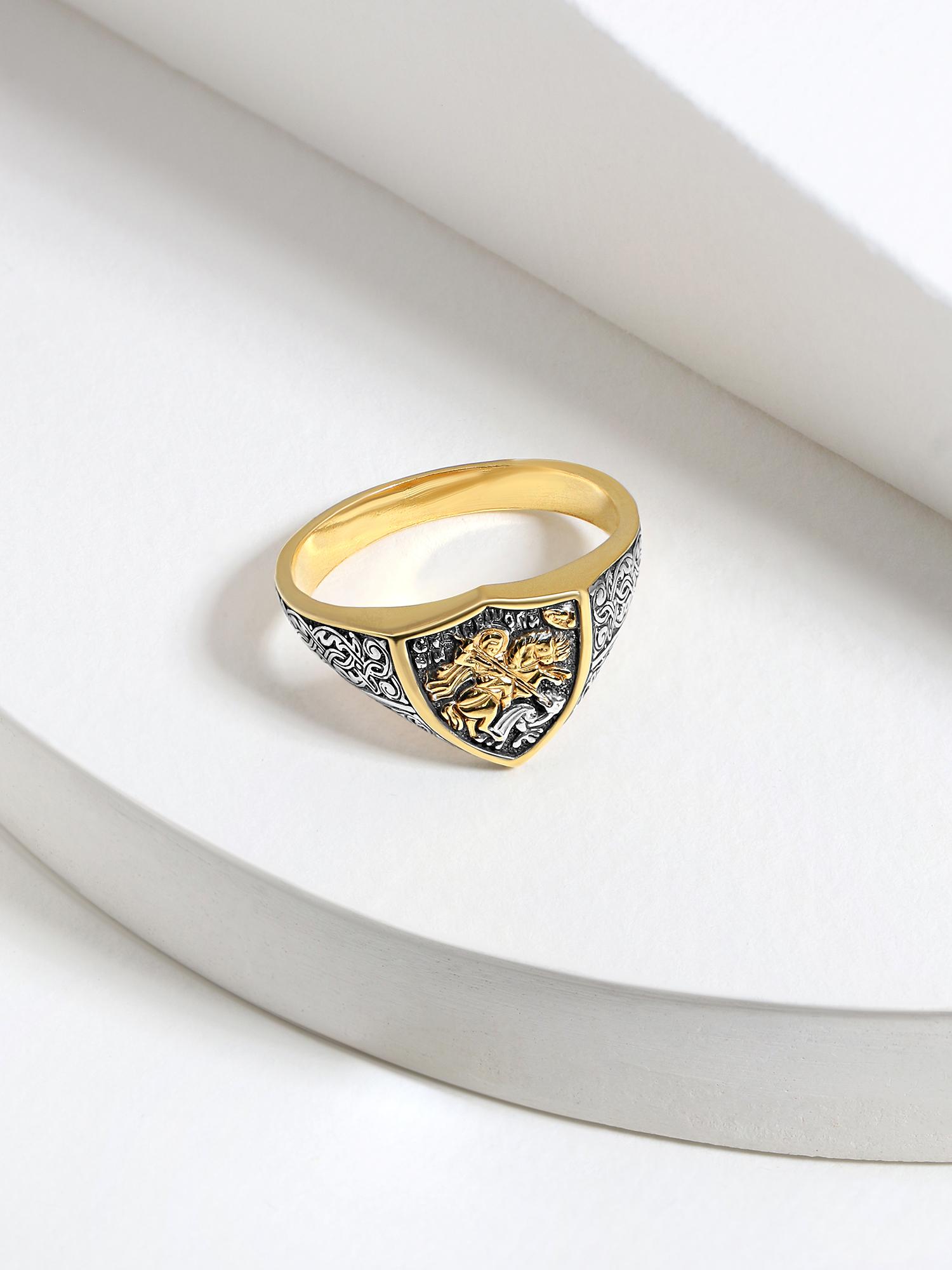 Печатка мужская из золочёного серебра с чернением - Святой Георгий Победоносец 925 пробы 1-173чз