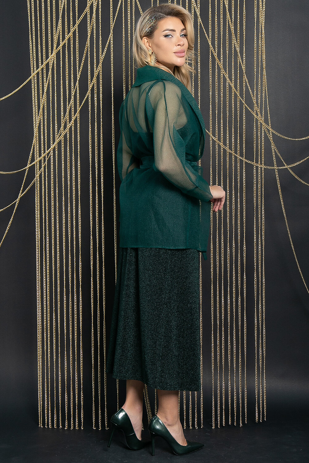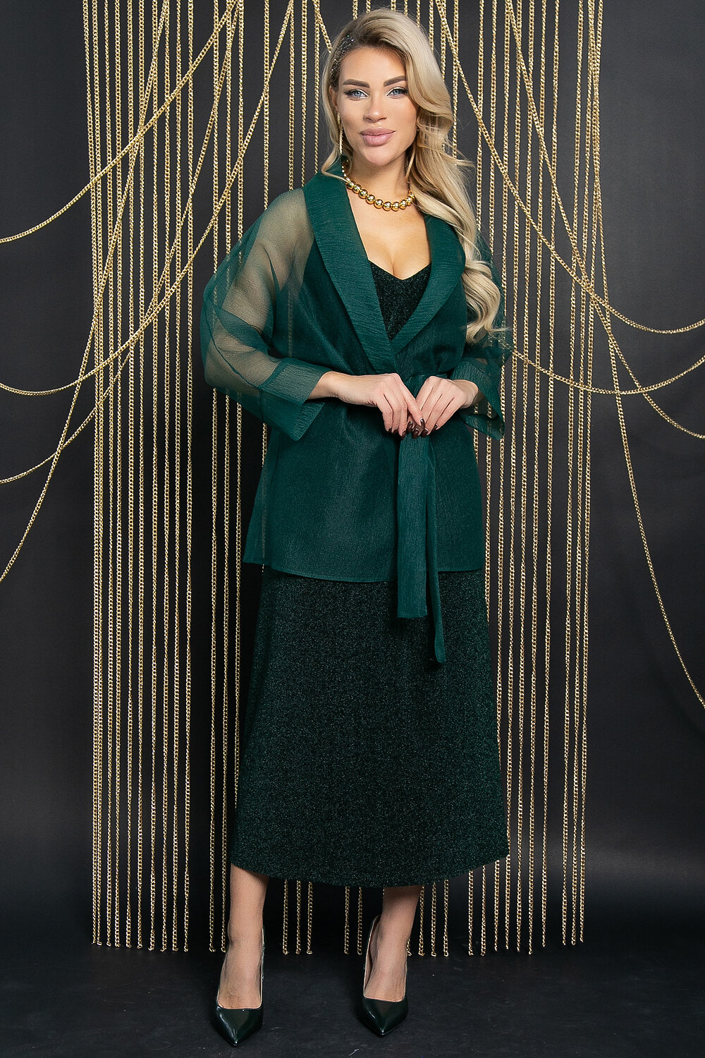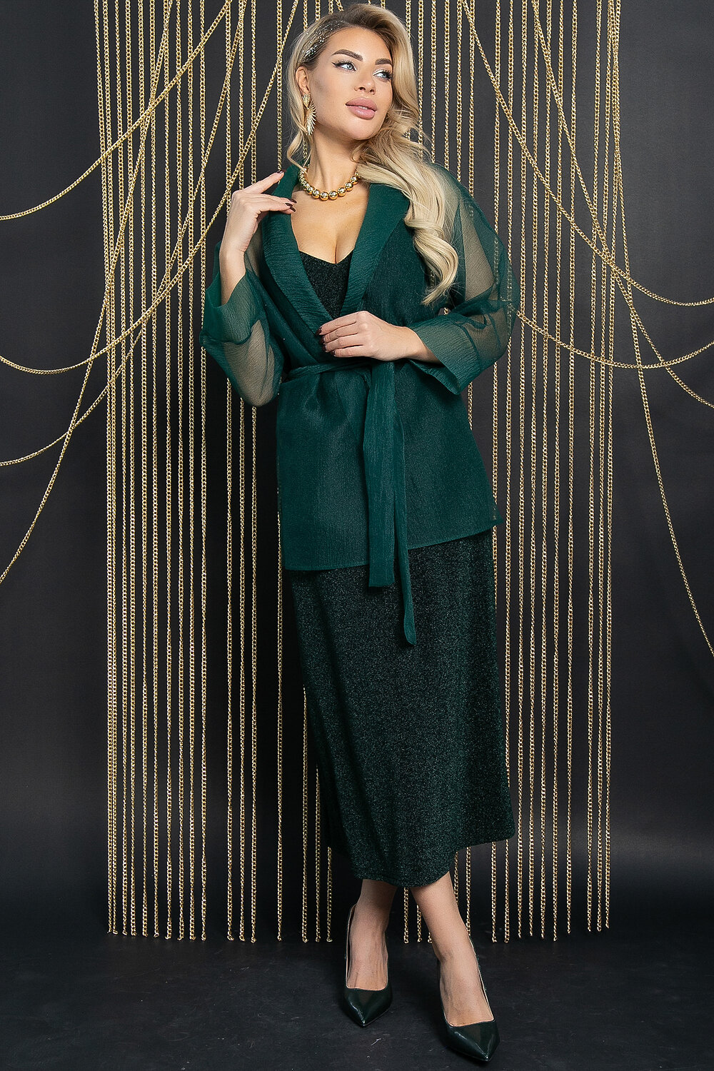 Костюм представляет собой очаровательное длинное платье-комбинацию и жакет из органзы. В сочетании эти два предмета создадут изысканный и утончённый образ, который будет уместен на любом мероприятии. Дополните костюм аксессуарами и обувью, чтобы создать разнообразные и стильные варианты.