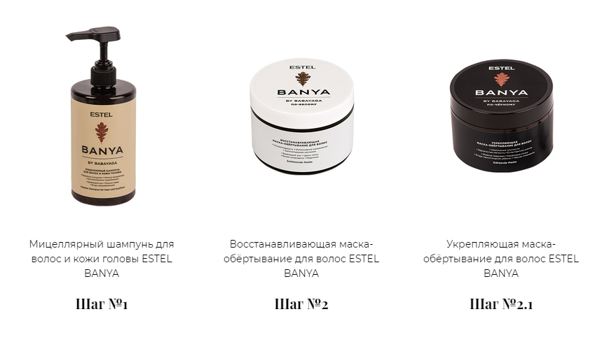 ESTEL BANYA — процедура, которая включает всего два шага: очищение берёзовым соком и обёртывание с эффектом восстановления или ламинирования. В формуле ESTEL BANYA соединились травы и ягоды, которые, скорее всего, заваривала в своём зелье красоты сама Баба-яга: полынь, ягоды можжевельника, медуница и многие другие. Благодаря обёртыванию ценные компоненты становятся ещё ценнее и быстро попадают в структуру волос.