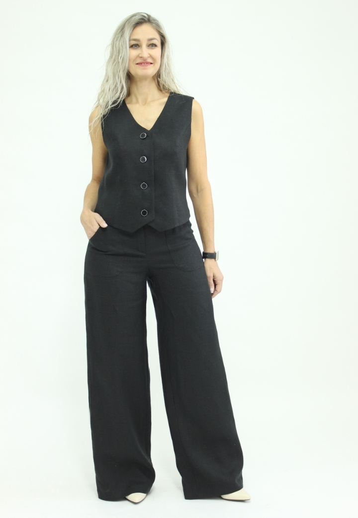 Жилет полуприлегающий. По переду рельефы. Спинка приталена вытачками, ширина регулируется хлястиками. Длина изделия 53 см.