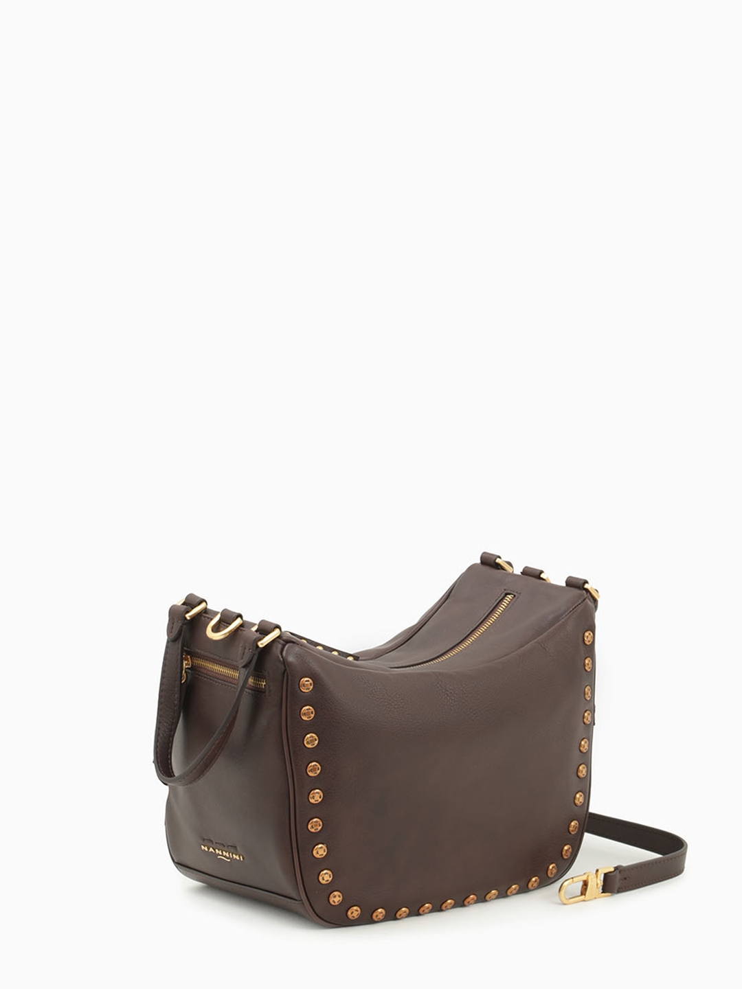 Сумка от итальянского бренда NANNINI выполнена из натуральной кожи, декорирована клепками в винтажном стиле. Данная модель закрывается на молнию. Прилагается длинный ремень на плечо, максимальная длина 125 см, регулируется. В комплекте маленькое зеркало, в кожаном чехле.