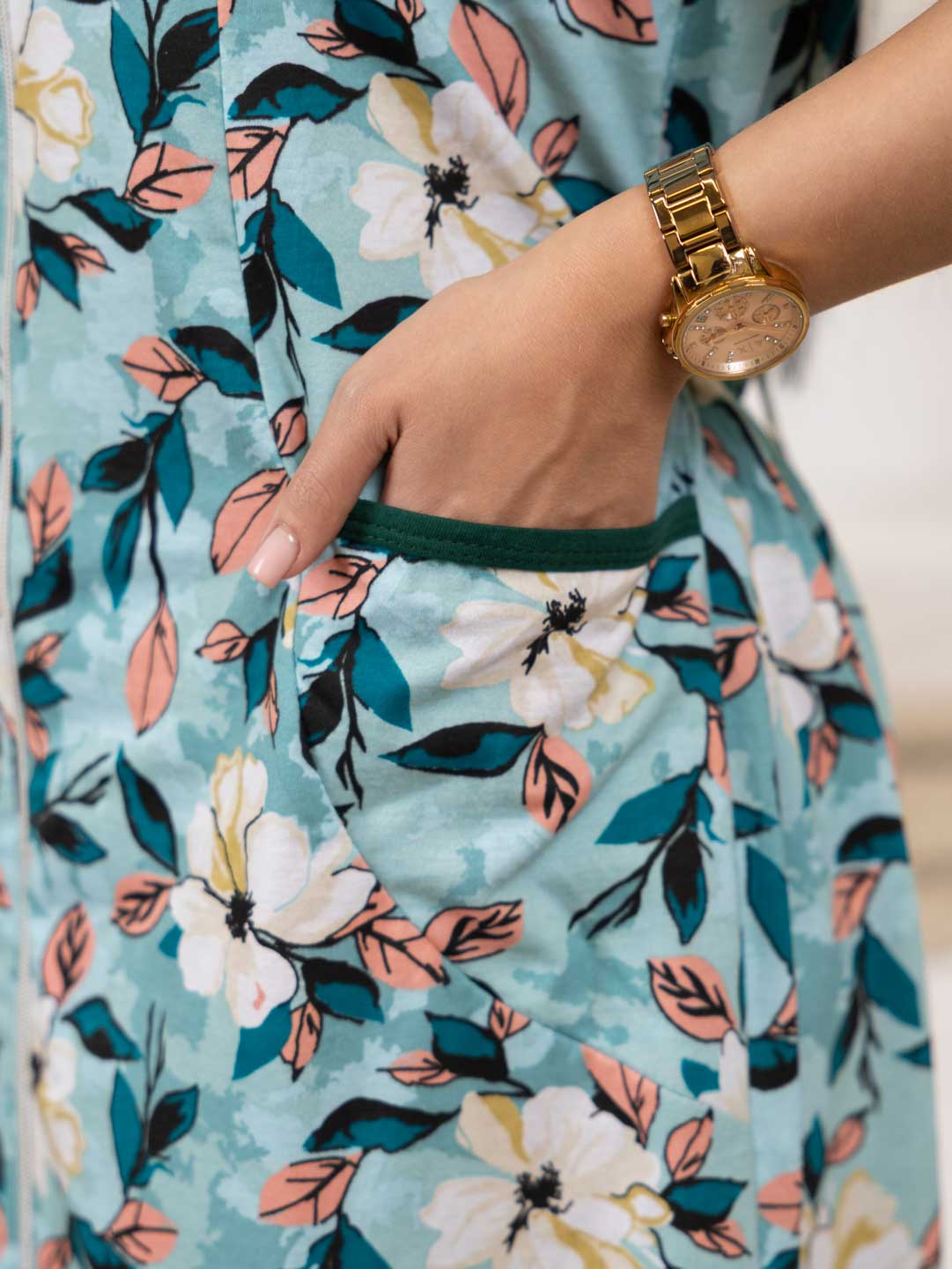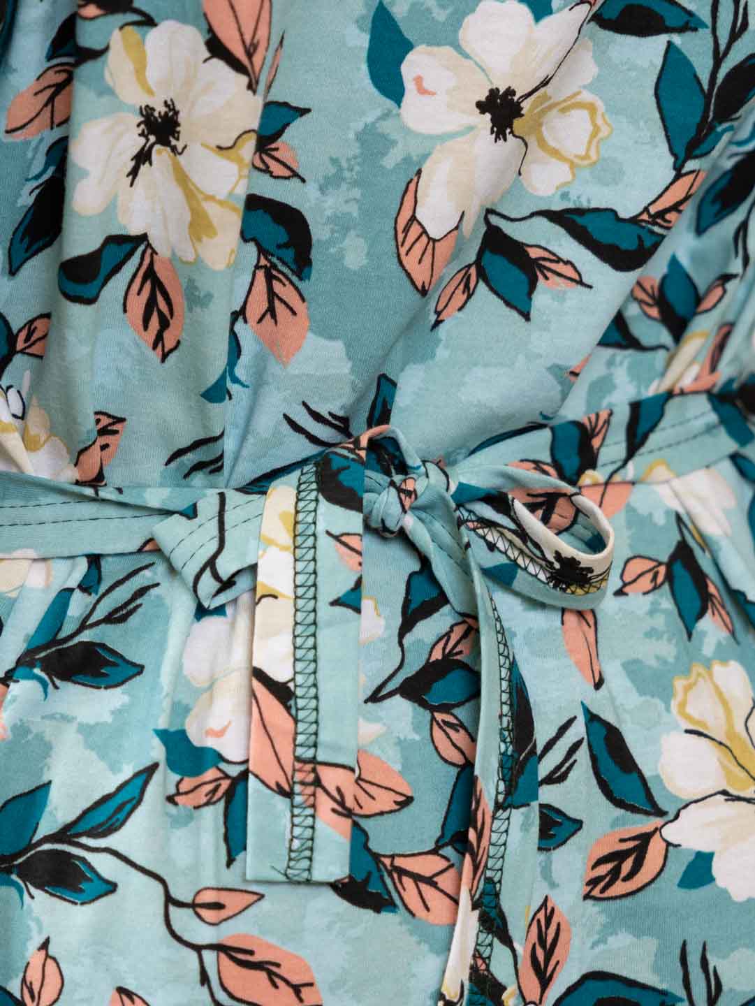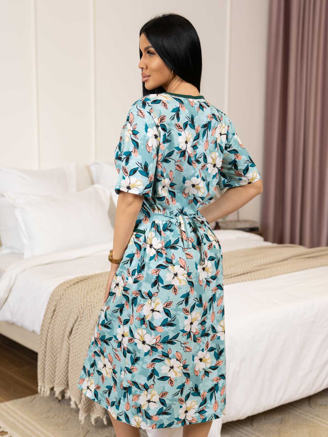 Халат женский из трикотажного полотна - кулирка, длиной ниже колена, прямого силуэта. Полочка с рельефами и карманами в них. Рукав втачной базового покроя длиной до линии локтевого сгиба.