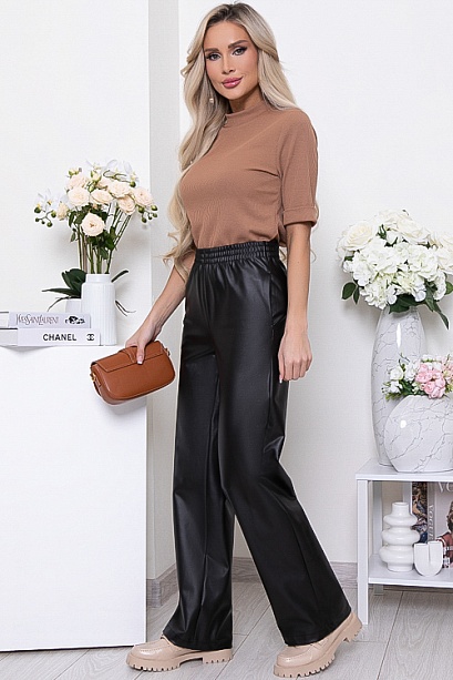 Комфортные брюки прямого,свободного силуэта из экокожи в черном цвете.В боковых швах функциональные карманы,удобную посадку по талии обеспечивает эластичный пояс на резинке.