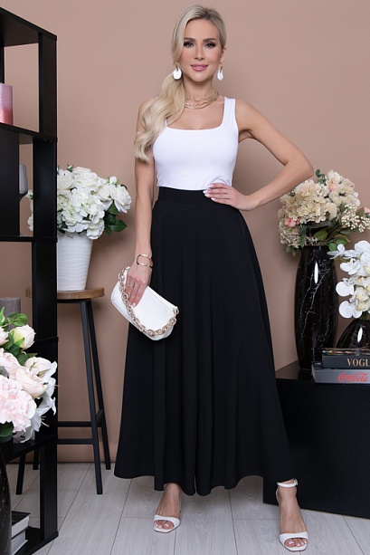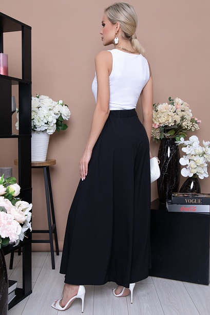 Брюки-юбка из текстильного полотна свободного силуэта с притачным поясом и застежкой молния в боковом шве.