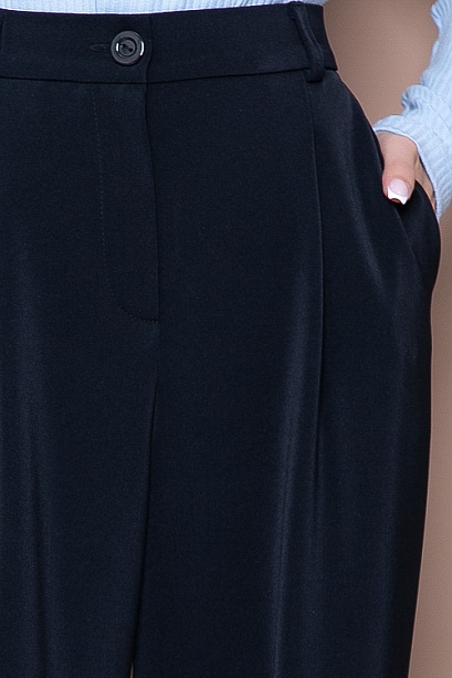 * Брюки-палаццо из комфортной костюмной ткани,с высокой посадкой по талии,застегивающиеся на молнию в гульфике.По переду от пояса застрочены мягкие складки.В боковых швах функциональные карманы.Пояс притачной,застегивающийся на одну пуговицу,посаженный по спинке на резину.