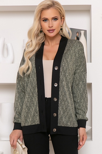 Кардиган из трикотажного полотна с контрастной отделкой и застежкой на петли и пуговицы по центру.