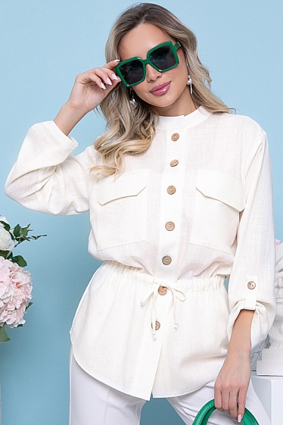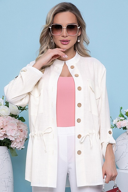 Жакет из комфортной льняной ткани прямого,свободного силуэта с центральной застежкой на пуговицы.По переду накладные карманы с клапанами.По талии регулируемая кулиска.