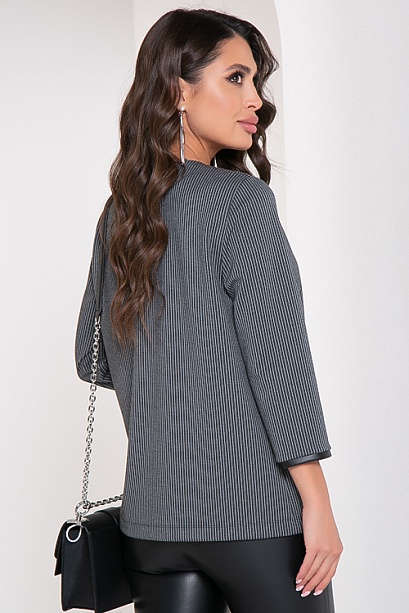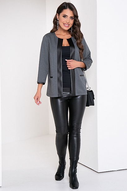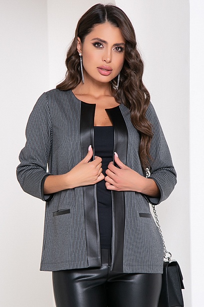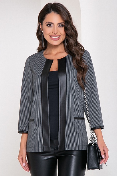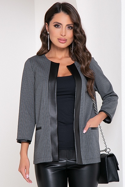 Жакет из трикотажного полотна в полоску, свободного силуэта с отделкой из эко кожи.По полочке удобные прорезные карманы.