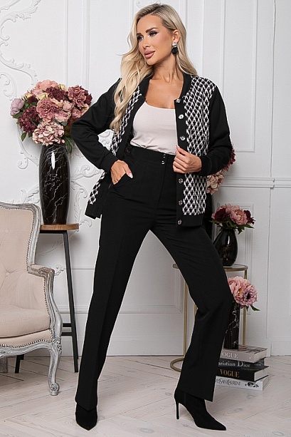 Комбинированный жакет из жаккардового трикотажного полотна и черного джерси с центральной застежкой на петли и пуговицы.