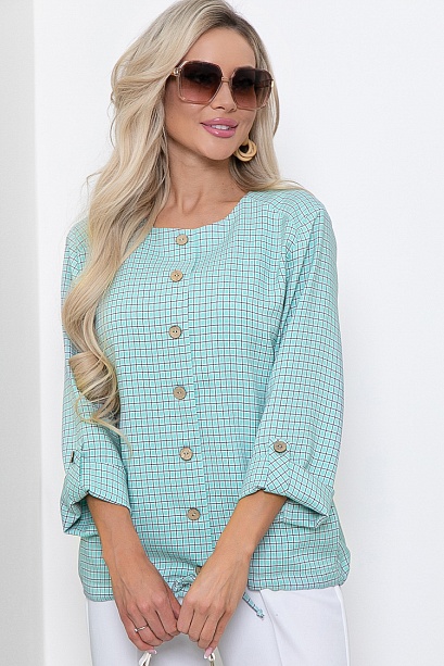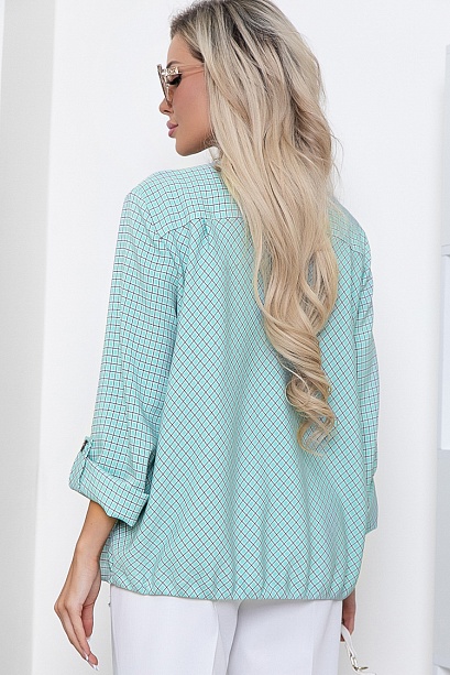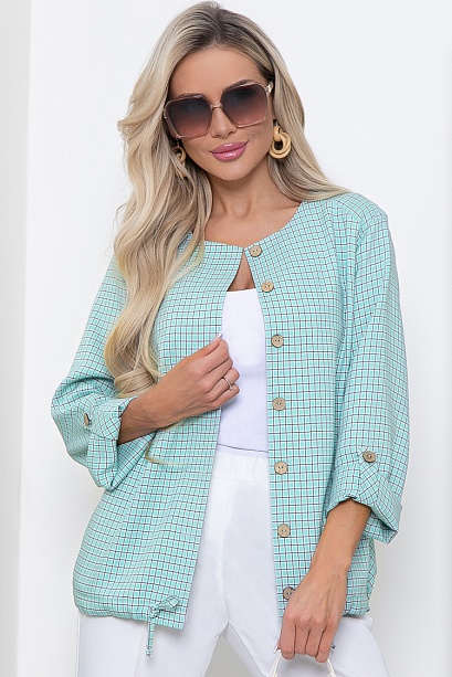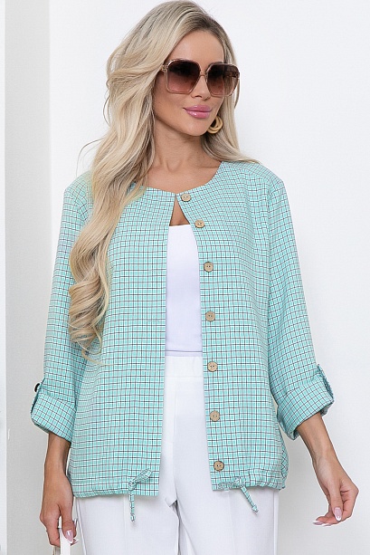 Жакет из комфортной костюмной ткани в мелкую клетку свободного силуэта с кулиской по низу.Центральная застежка на петли и пуговицы,в боковых швах функциональные карманы.Рукава втачные длинные с патой.
